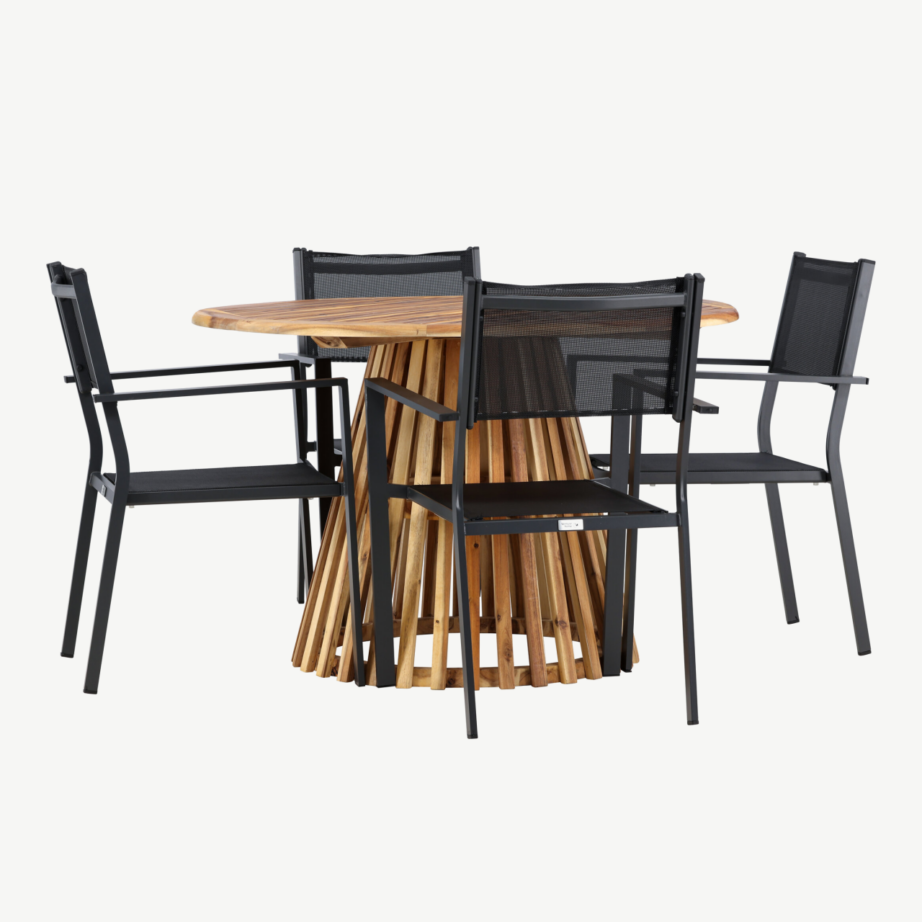 -27% Tasuta tarne -27% Tasuta tarne Ümmargune akaatsiapuidust aialaua ja mustade köistöölidega söögikomplekt Lumpur-Lindos (Ø120 cm, 4 tooli), GR24352 Aia söögilaua komplektid 1433,99 € Algne hind oli: 1433,99 €.1046,99 €Current price is: 1046,99 €. Lisa korvi Vaata toodet