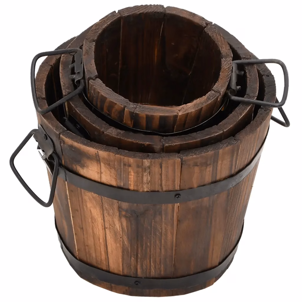 See 3-osaline nulupuidust taimeämbrite komplekt on praktiline lahendus dekoratiivtaimede, lillede, juurviljade ja ürtide kasvatamiseks. Põletatud välimusega viimistlus ja metallelemendid annavad istutusnõudele rustikaalse ilme, mis sobib erinevatesse aedadesse ja õueruumidesse.