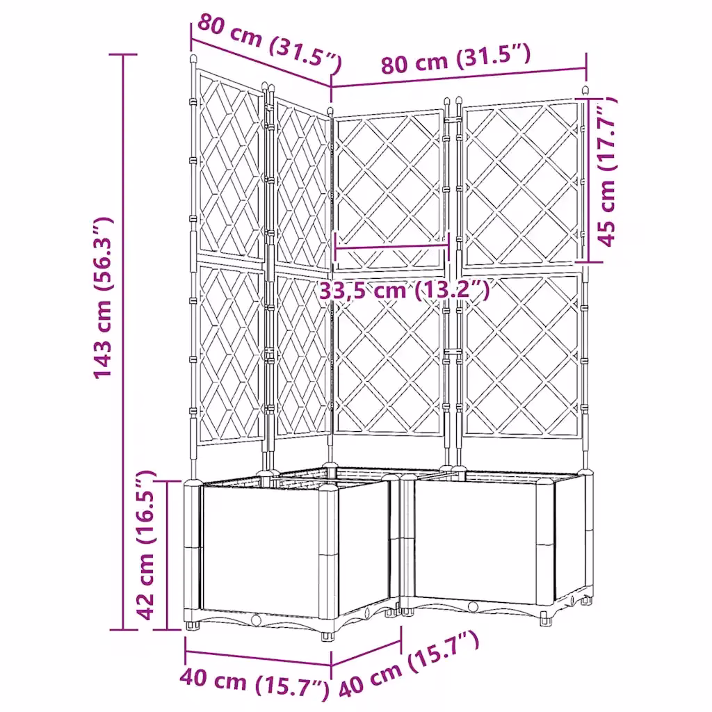 • 3 istutuskasti trellisega komplekt – moodustab ühtse ja funktsionaalse lahenduse ronitaimedele ning aitab luua rohelise seina efekti.