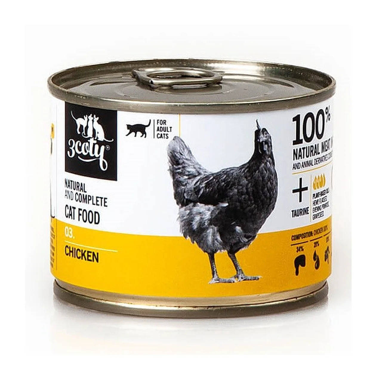 Teraviljavaba ja monoproteiinne 3coty kanaliha märgtoit sobib hästi täiskasvanud kassidele, toetab üldtervist ja aitab toiduallergiate puhul.