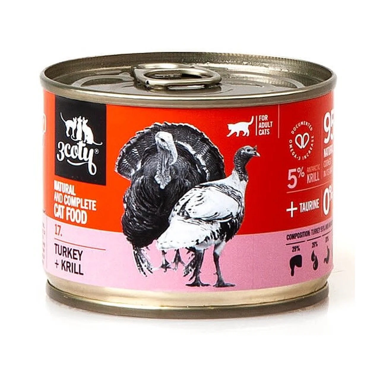 3COTY 17. Turkey and krill on täisväärtuslik märg kassitoit, mis on loodud toetama täiskasvanud kasside tervist ja sobib kõigile tõugudele. Toidu peamised koostisosad on kvaliteetne kalkuniliha ja Antarktika krill, pakkudes looduslikult hästi seeduvat ja toitaineterikast valikut, mis vastab ka toiduallergiliste või tundliku seedimisega kasside vajadustele. Toode on suhkru-, soja-, gluteeni- ja teraviljavaba, ei sisalda kunstlikke värvaineid ega säilitusaineid ning sobib ka üldise tervise toetamiseks ja allergiate ennetamiseks.