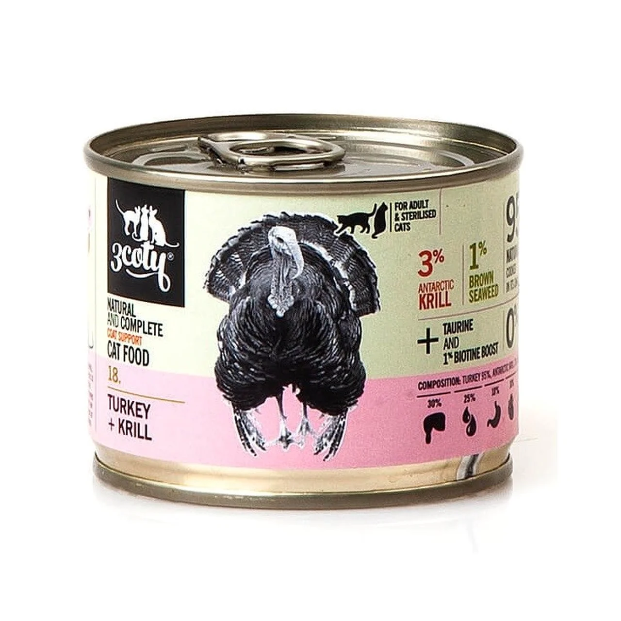 3COTY 18. Turkey with Krill Coat support on täisväärtuslik, teraviljavaba märgtoit täiskasvanud kassidele. See toit on mõeldud eelkõige kassidele, kellel esineb naha- ja karvkattega seotud probleeme, kalduvust ülekaalule või toiduallergiaid. Kalkuni ja Antarktika krilli koostis aitab toetada naha ning karvkatte tervist, pakkudes looduslikke oomega-3 rasvhappeid. Toode sobib ideaalselt steriliseeritud, tundlike või allergilistele kassidele ning neile, kes vajavad abi kehakaalu säilitamisel. Märg kassitoit on pakendatud mugavasse 180 g konservi, mis sobib erineva suurusega kassidele igapäevaseks toitmiseks.