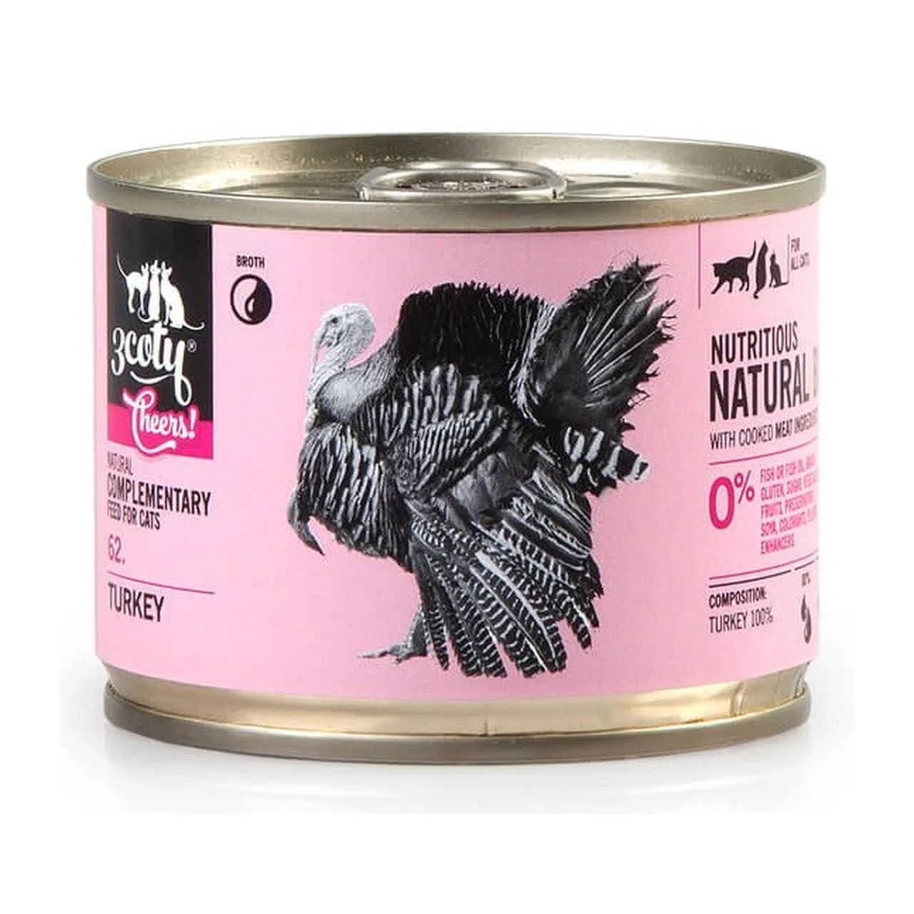 3coty Cheers! 62 kalkunilihaga märgtoit sobib täiskasvanud ja allergilistele kassidele ning vastab ka kõige tundlikuma kassi vajadustele. See toode on valmistatud looduslikust kalkunilihast ja puljongist, olles monovalgulise koostisega – toit sisaldab vaid ühe loomaliigi valke, mis vähendab tunduvalt allergiaohtu. Kuna toidus ei ole teravilja, gluteeni, kana, soja ega suhkrut, sobib see eriti hästi allergilistele või toidutundlikele kassidele. Kompaktses 160-grammises purgis märgtoit on maitsev viis kassile vedeliku tarbimise suurendamiseks, mis toetab tema üldist tervist ja eriti neerude tööd.