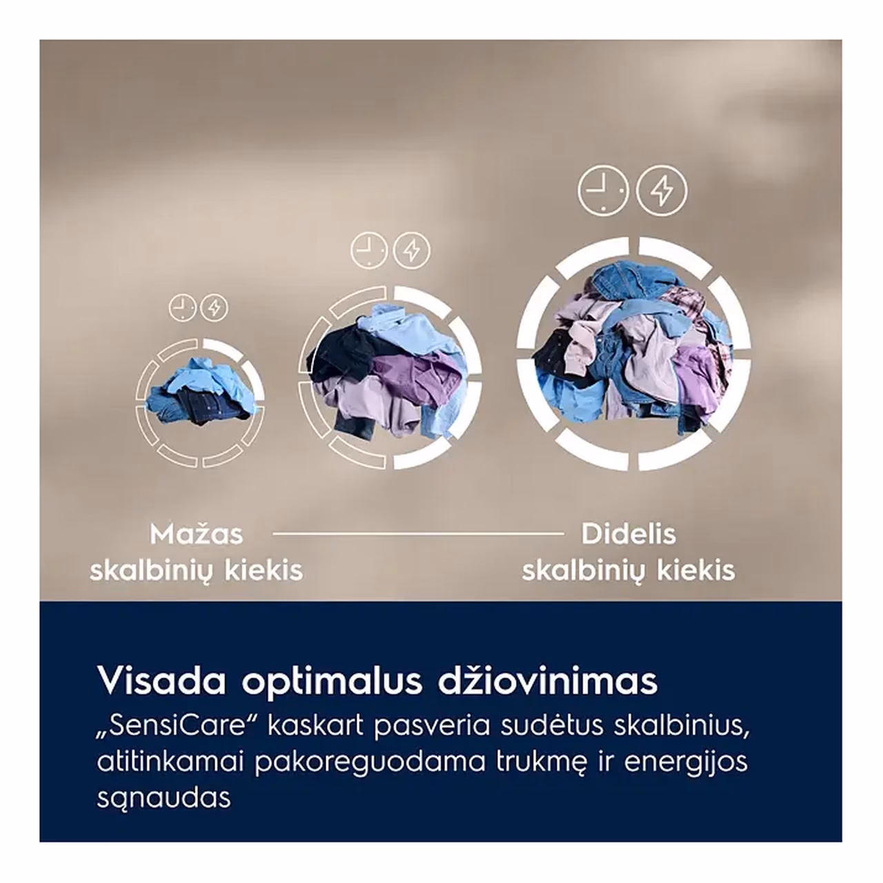 SensiCare süsteem aitab kohandada kuivatusprotsessi vastavalt pesukogusele et iga tsükkel oleks võimalikult täpne. Kuivatusaega ja energiakulu korrigeeritakse nii et pesu ei kuivaks üle ning riided ei muutuks liigselt kõvaks. Nii on energiasääst ja tekstiilide kaitse paremini tasakaalus ning ka väiksemad pesukogused kuivavad sobival ajal.