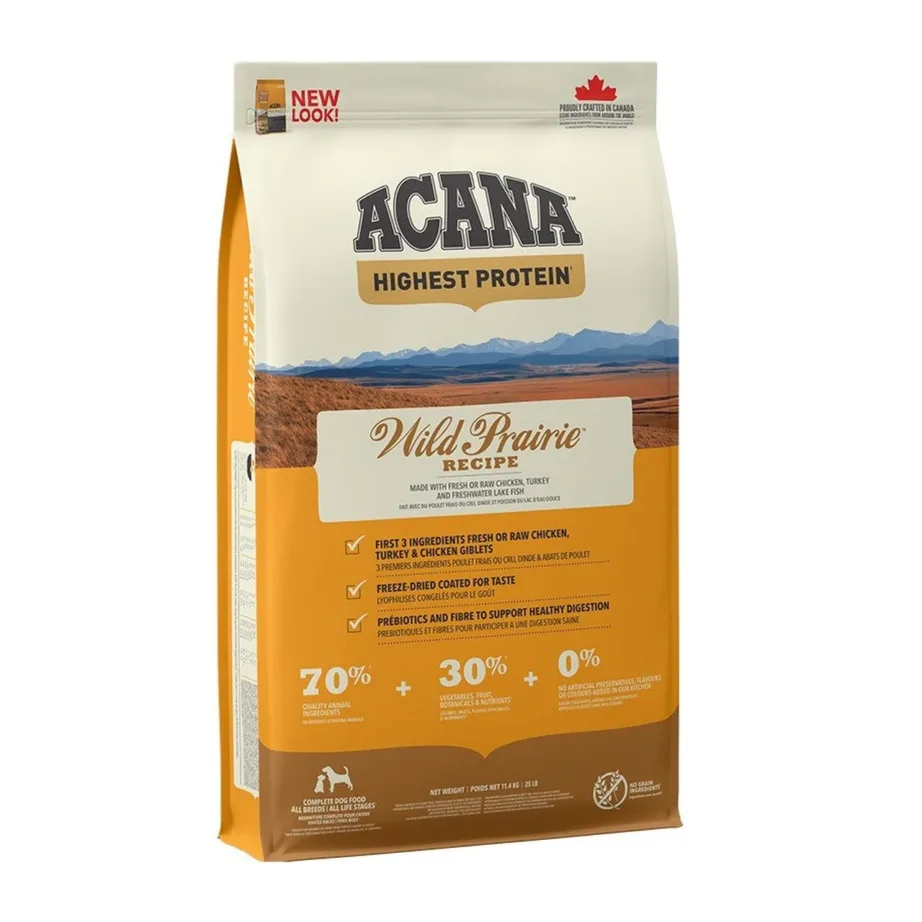 ACANA Highest Protein Wild Prairie Dog 11,4 kg on kõrge valgusisaldusega, tasakaalustatud kuivtoit, mis sobib kõikidele täiskasvanud koeratõugudele. See kana- ja linnulihapõhine kuivtoit on valmistatud suure lihasisalduse ning hoolikalt valitud taimsete koostisosadega. Teravilja- ja gluteenivaba retsept tagab kergesti seeditava toidu, milles puuduvad soja, suhkur ning kunstlikud värv- ja säilitusained. Toidule on lisatud looduslikke prebiootikume ja kiudaineid, mis toetavad koera üldist tervist ja lihaste arengut.