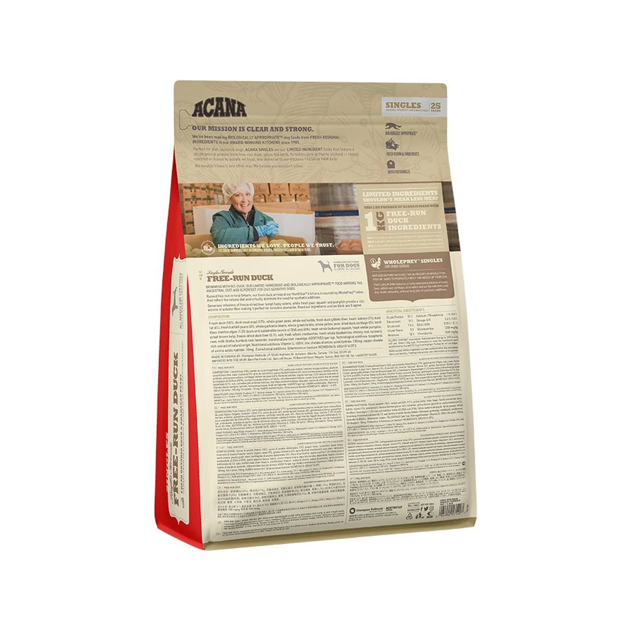 ACANA Singles Free-Run Duck on monoproteiinne kuivtoit, mis on loodud kõigile koeratõugudele ja igas vanuses koertele, sobides eriti tundliku seedimise ja toiduallergiatega lemmikutele. Koostis põhineb kvaliteetsel vabapidamisel kasvanud pardilihal ning retseptist puudub nii teravili, gluteen, kana kui ka kunstlikud värvained, muutes toidu ohutuks ka kõige nõudlikumale koerale. Tänu piiratud koostisosadele aitab ACANA Free-Run Duck vähendada toidutalumatust ning toetab üldist tervist ja seedimist.
