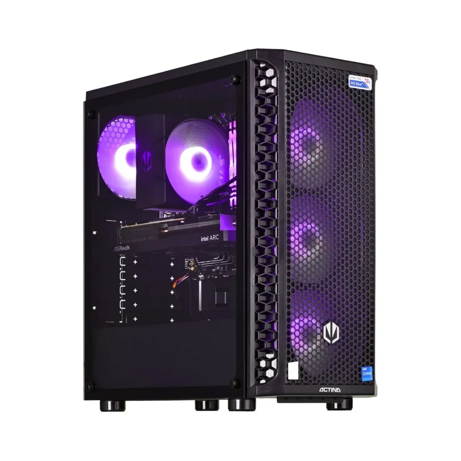 Actina KOMAAAGIP1379 on musta korpuse, klaasist külgpaneeli ja ARGB valgustusega mänguriarvuti, mille sisuks on Intel Core i5-12400F, 16 GB DDR4 RAM, 1 TB SSD ning Intel Arc A750 graafikakaart.