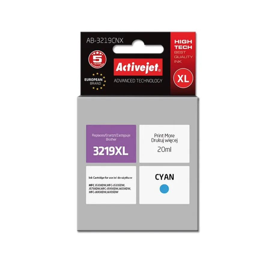 Activejet AB-3219CNX 20 ml XL tsüaantindi kassett Brother LC3219C asenduseks, kiibiga, sobib MFC J-seeria tindiprinteritele