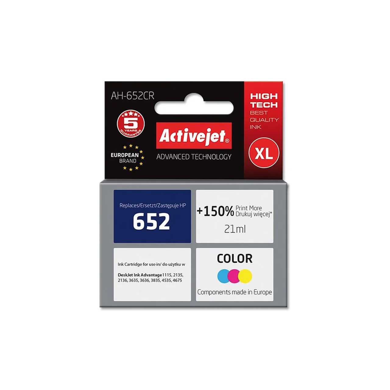 Activejet AH-652CR on XL-mahuga värviline tindikassett HP 652 printeritele, võimaldades kuni 500 kvaliteetset väljatrükki ning sisaldades 21 ml dye-tinti.