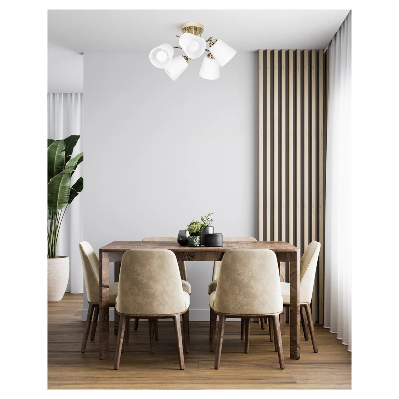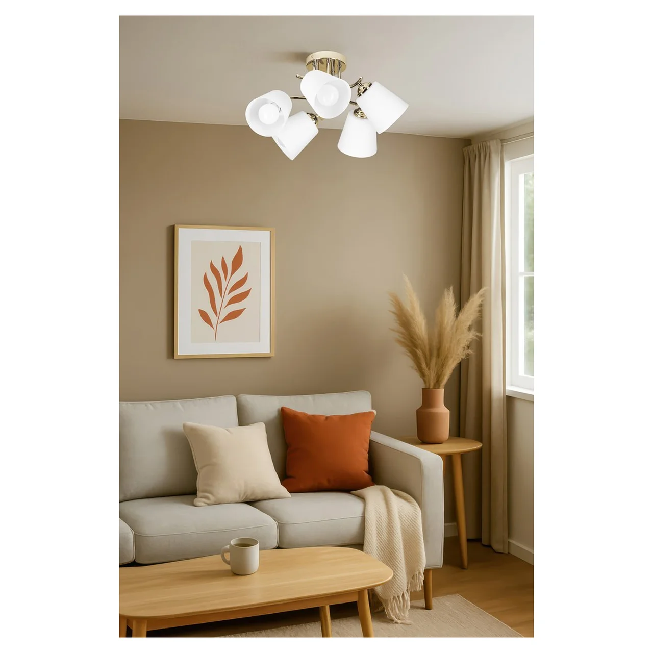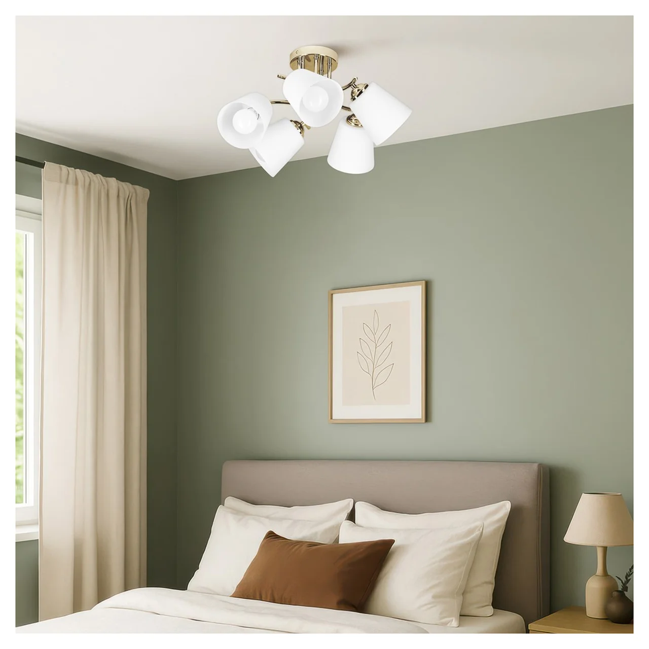 Kuldne viie E27 sokliga laelamp Activejet AJE-EMILY 5P GD ühendab metallkorpuse ja mattvalge klaasi, sobides ideaalselt elutuppa, magamistuppa või esikusse.
