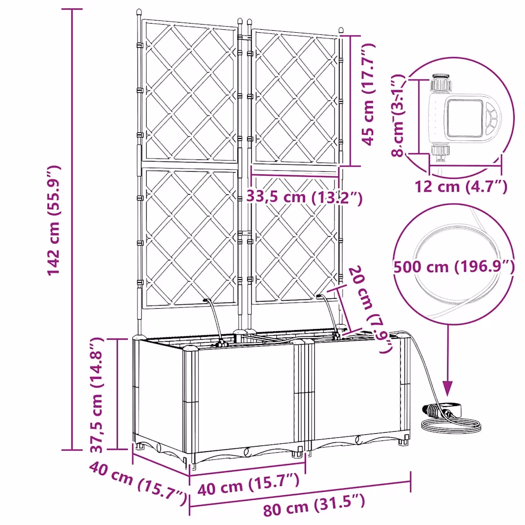 See istutuskast on praktiline lahendus, kui soovid kasutada efektiivselt vertikaalset pinda ja lisada oma aeda või terrassile rohkem rohelust. Tugev terasest konstruktsioon ja integreeritud kastmissüsteem loovad usaldusväärse aluse ronitaimedele ja muudele istutustele. Valides selle komplekti, saad kaks ühilduva välimusega istutuskasti, millega on lihtne kujundada läbimõeldud ja hooldatav väliruum.