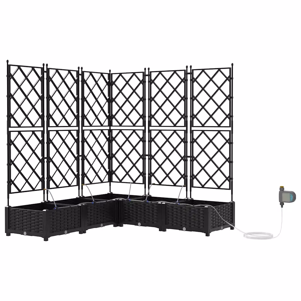 Kui soovid luua selge struktuuriga ja hõlpsasti hooldatavat istutusala, on see trellise ja kastmissüsteemiga istutuskastide komplekt praktiline lahendus. Vastupidav teras, kaasaegne must disain ja viis eraldi istutuskasti võimaldavad kujundada mitmekesise ja ruumisäästliku haljastuse nii aias kui terrassil.