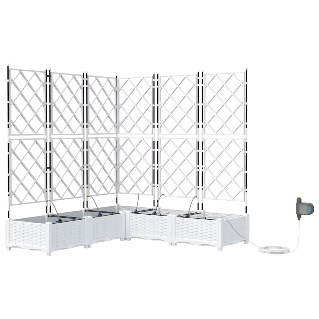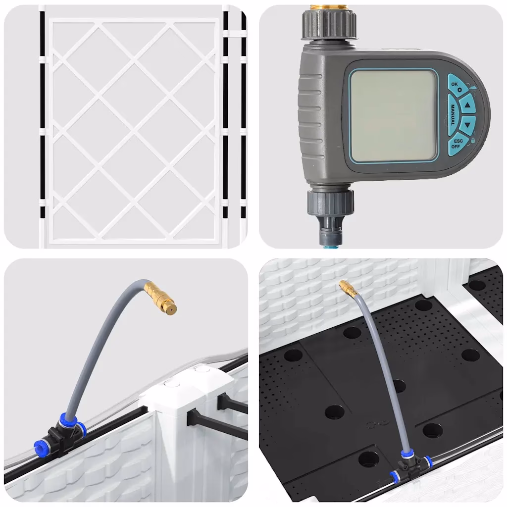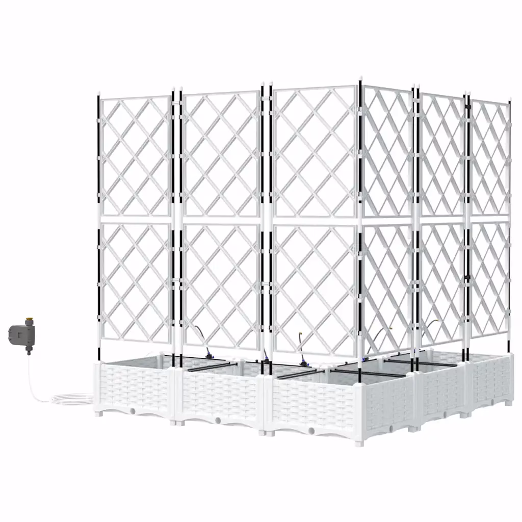 Need valgest terasest aia istutuskastid trellise ja kastmissüsteemiga võimaldavad kasvatada köögivilju, maitsetaimi ja ronitaimi kompaktselt ning korrapäraselt. Viieosaline komplekt loob ühtse lahenduse aia nurka või terrassile, pakkudes taimedele kindlat tuge ja sobivat kasvukeskkonda. Tänu integreeritud kastmissüsteemile on taimede hooldus lihtsam ning istutusalad püsivad ühtlasemalt niiskena ka pikema eemaloleku ajal.
