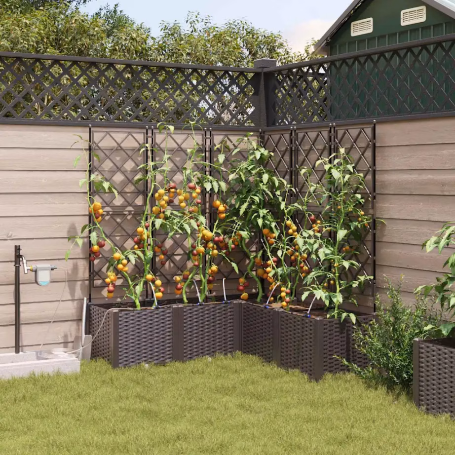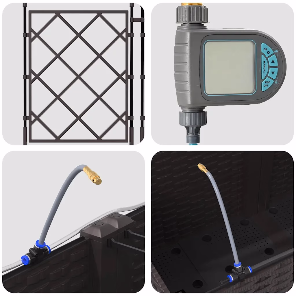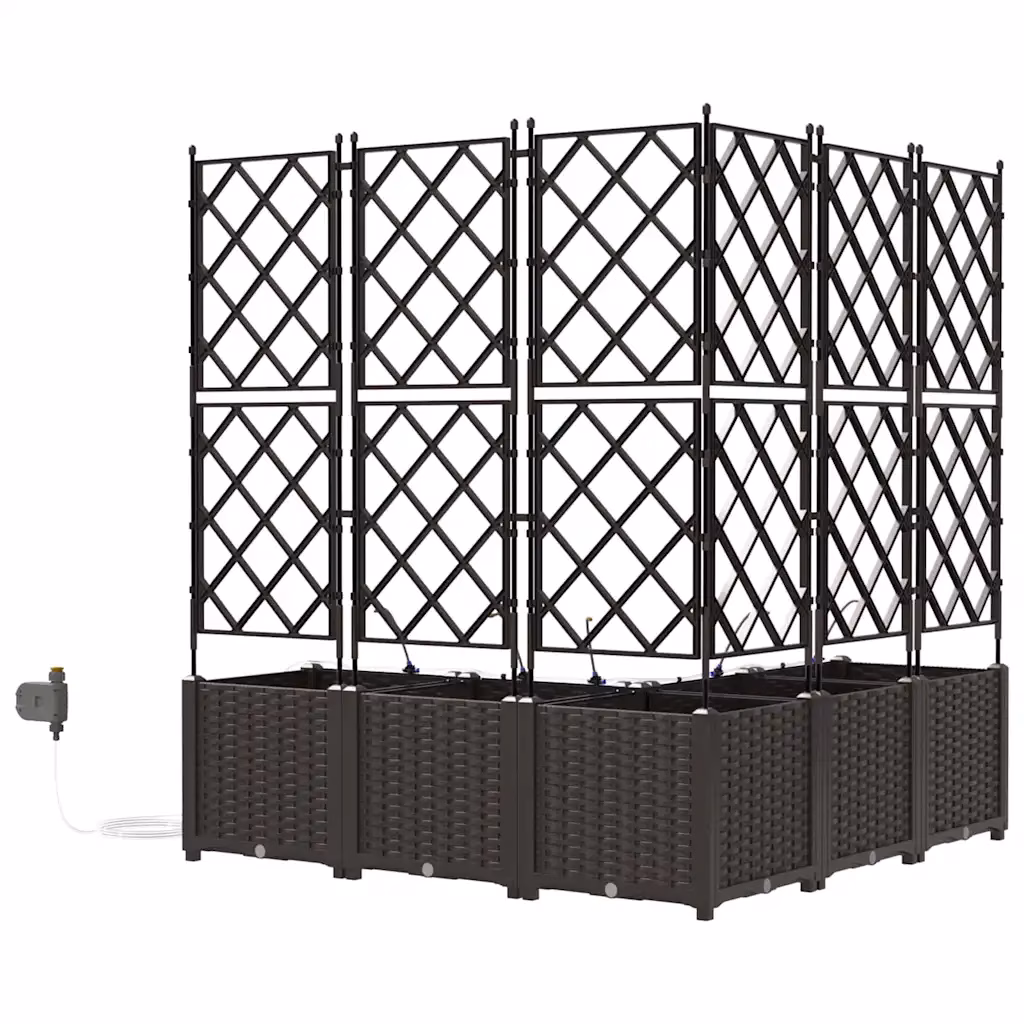 See pruunist terasest valmistatud aia istutuskastide komplekt pakub praktilist lahendust ronitaimede ja köögiviljade kasvatamiseks aias või terrassil. Komplektis on 5 omavahel sobituvat istutuskasti, mis võimaldavad luua hästi organiseeritud istutusala. Integreeritud kastmissüsteem aitab hoida mulla niiskena, muutes taimede eest hoolitsemise lihtsamaks ka siis, kui oled mõnda aega kodust eemal.