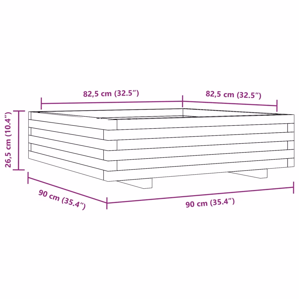 - Praktilised mõõdud 90 x 90 x 26,5 cm võimaldavad kasutada taimekasti nii üksiku aktsendina kui ka mitme kastiga järjestatud peenrana.