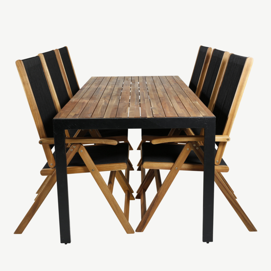 - Komplekti kuulub: 1 akaatsiapuidust lauaplaat (205 x 90 x 76 cm) ning 6 kokkupandavat aiatooli (106 x 56,8 x 74 cm), millel on akaatsiapuidust raam ja mustast polüesterköiest istmed ja seljatoed