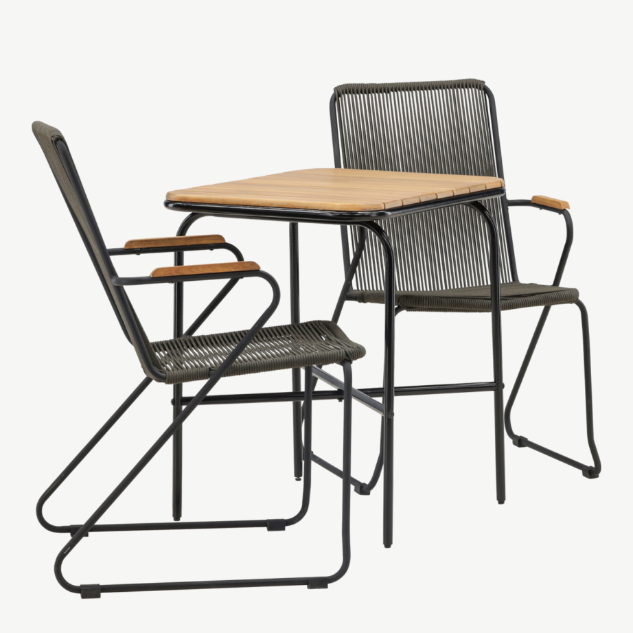 - Toolide konstruktsioon: Toolide raamid on mustast terasest, pakkudes kindlust ja vastupidavust. Istumisosa ja seljatugi on valmistatud tugevast polüpropüleen-nöörist, mis on tumehalli tooni ning vastupidav välitingimustes.