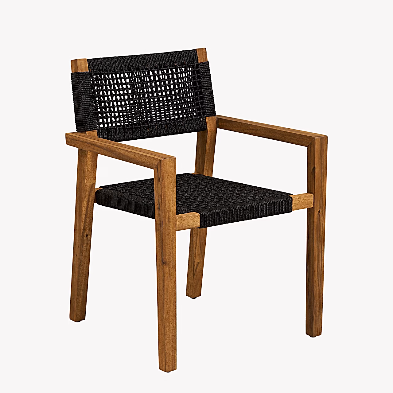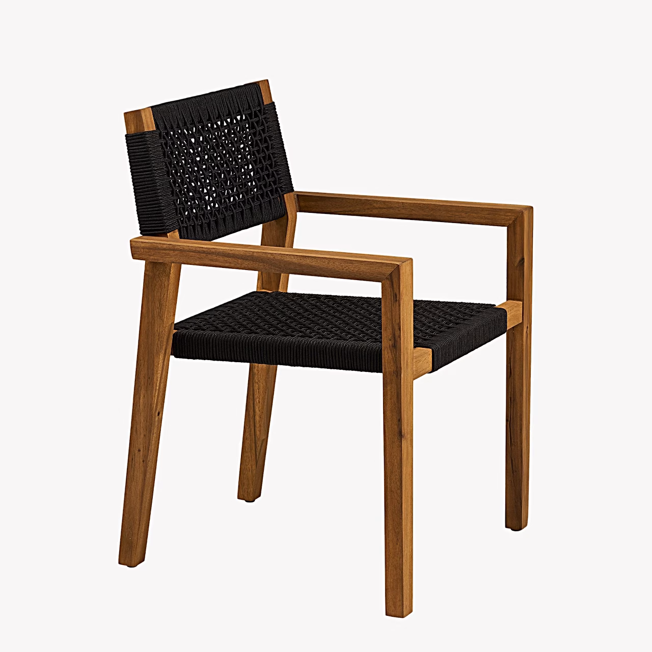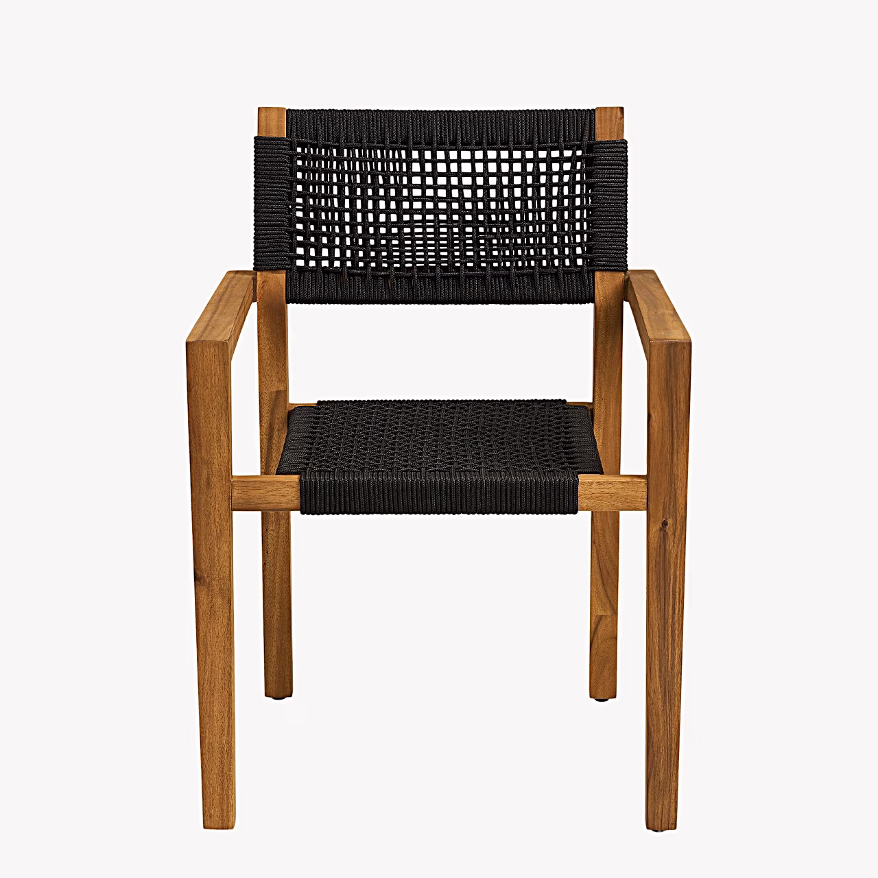 Tooli juures on ühendatud akaatsiapuit, köiematerjal ja teras. Akaatsiapuit lisab toolile sooja ja naturaalset ilmet, tuues esile puidusüü ja loodusliku tonaalsuse. Istme ja seljatoe nöör- või köiepunutis annab istumisalale visuaalset kergust ning loob modernse mulje. Metallraam on viimistletud musta tooniga, mis raamib puidu ja punutise selgelt välja ning rõhutab tooli kaasaegset joont.