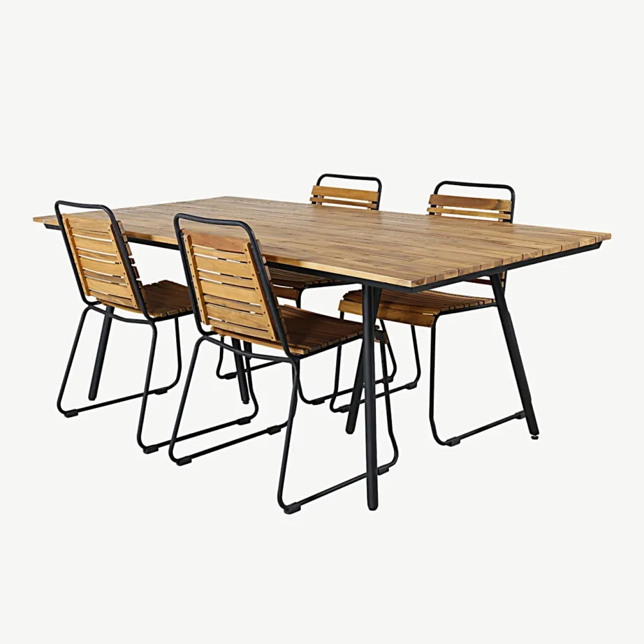 - Materjal: Tugevast akaatsiapuidust lauaplaat ja toolide istmed loovad naturaalse ning hubase õhustiku. Akaatsiapuit on hinnatud oma vastupidavuse ning kauni, sooja tooni poolest, sobides ideaalselt põhjamaisesse aeda.