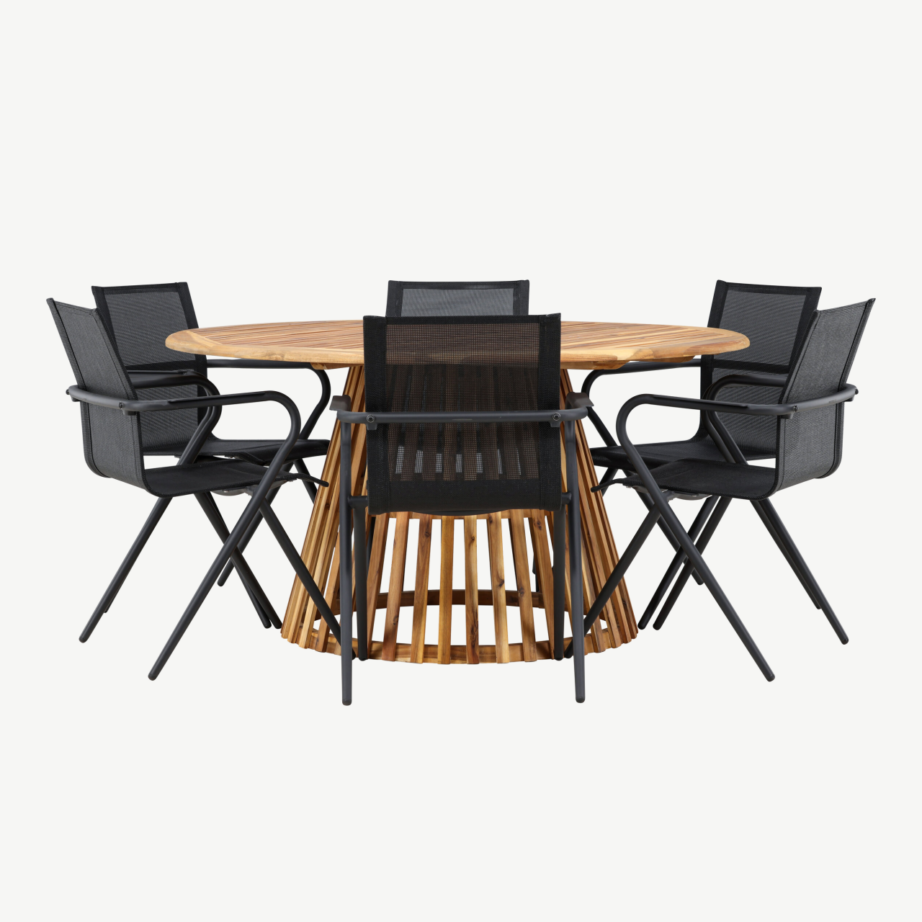 - Komplektis: üks ümmargune akaatsiapuust laud (Ø150 cm) ja kuus alumiiniumraamiga musta textilene tooli