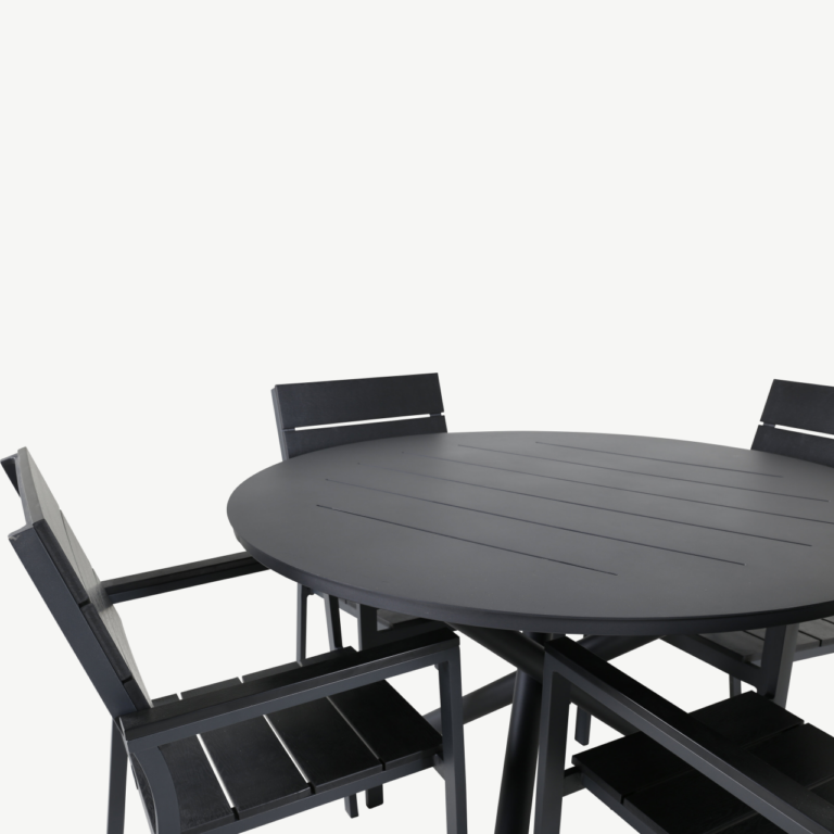 - Ümmargune söögilaud Alma – Valmistatud kergest ja vastupidavast mustast alumiiniumist. Laua läbimõõt on 120 cm ning kõrgus 75 cm. Alumiiniumraam ja lauaplaat tagavad korrosioonikindluse ning sobivuse õuekeskkonda. Lihtne disain ja must toon võimaldavad lauda hõlpsasti sobitada igasse põhjamaise stiiliga õuealasse.
