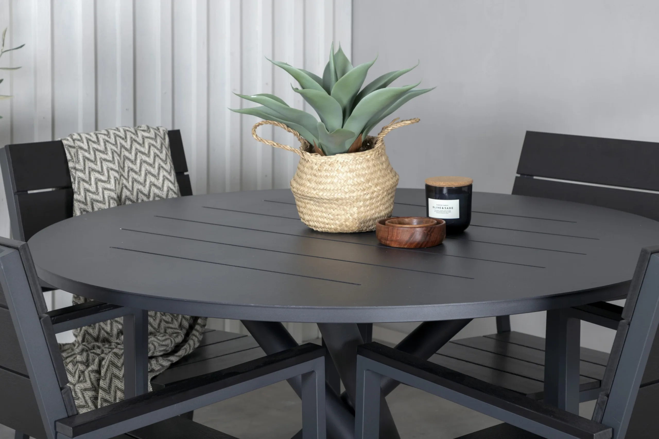 Must ümmargune aiamööblikomplekt Alma ühendab põhjamaise minimalistliku disaini ning vastupidavad materjalid, olles sobiv valik nii avarale terrassile, väikesele rõdule kui ka aeda. Komplekt pakub mugavat ja elegantset keskkonda suvisteks einehetkedeks või mõnusateks koosviibimisteks pere ja sõpradega.
