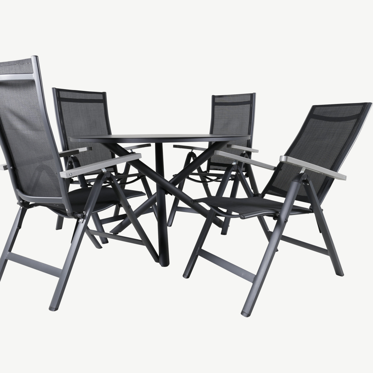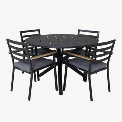 Loo oma terrassile või aeda pilkupüüdev ning mugav koosviibimise paik mustast ümmargusest aiamööbli komplektist Alma. Komplekti kuuluvad elegantne, ümmargune musta viimistlusega alumiiniumlaud ning neli reguleeritava seljatoega Albany sari tooli. See modernne ja praktiline lahendus sobib ideaalselt õhtusöökideks perega või külaliste võõrustamiseks vabas õhus.