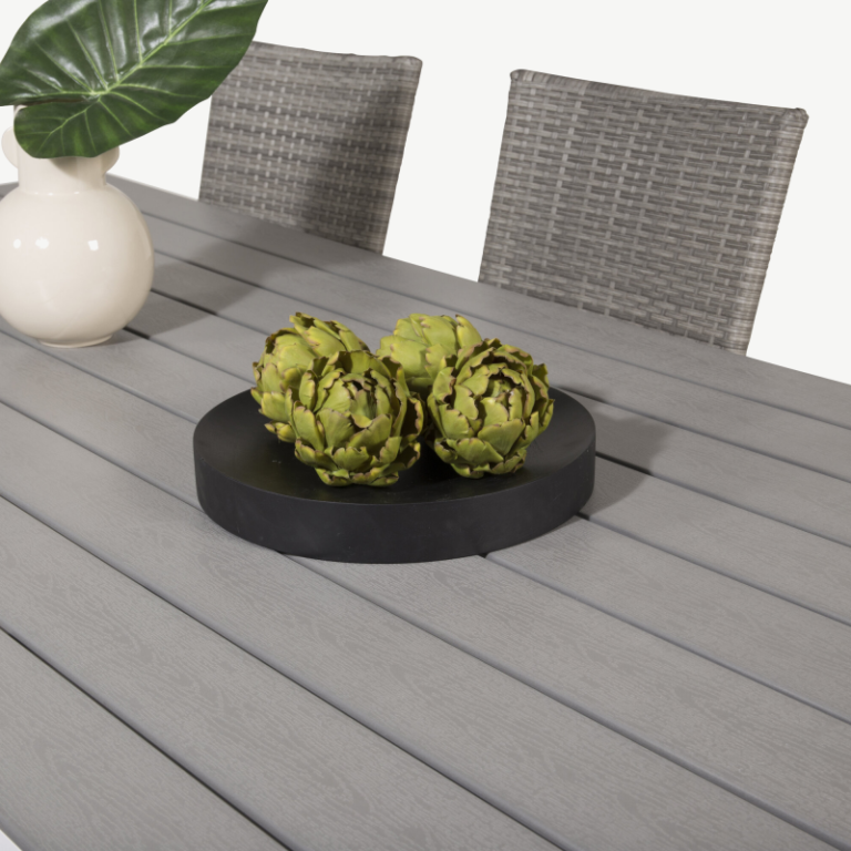 Laua plaat on valmistatud kvaliteetsest puitplastkomposiidist, mis ühendab puidu naturaalse välimuse ja plastiku vastupidavuse. See materjal on ilmastikukindel, ei vaja regulaarset hooldust ning talub nii päikest kui ka vihma ilma kulumise või pleekimiseta. Tugev metallraam tagab stabiilsuse ja pikaajalise kasutuse.