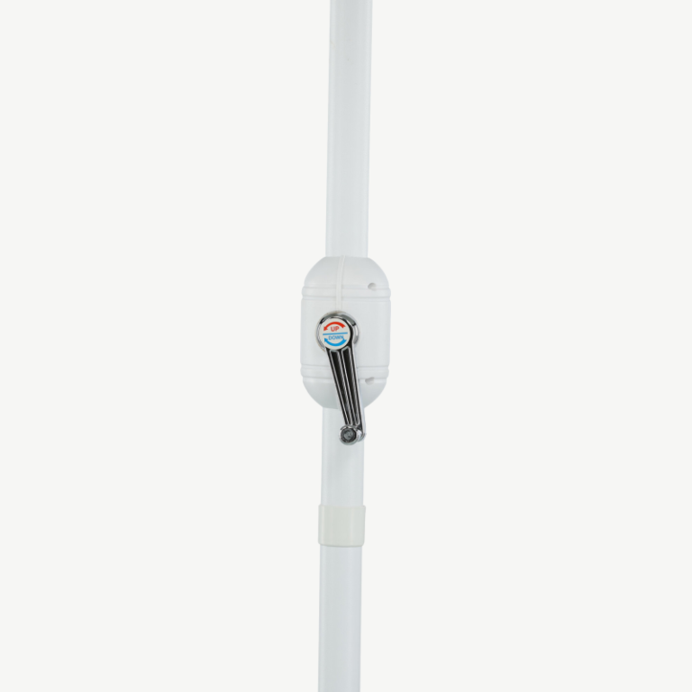 Komplekti keskmes on nutikas ja stiilne päikesevari, mis kinnitub otse laua keskele. Selle valge kangas ja alumiiniumraam pakuvad tõhusat kaitset kõrvetava päikese eest, võimaldades nautida sööki varjus ka kõige kuumematel päevadel. Tänu kvaliteetsetele materjalidele on vari vastupidav ning kergesti avatav ja suletav.