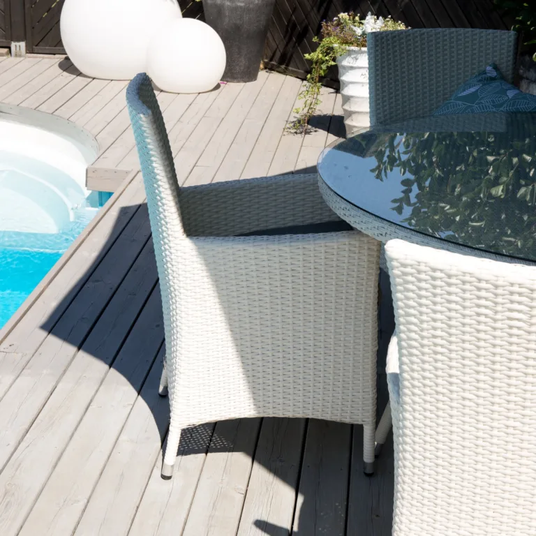 Tooli raam on valmistatud tugevast ja roostekindlast alumiiniumist, mis tagab kerge kaalu ning pikaajalise vastupidavuse. Kunstrottangist istmeosa on ilmastikukindel ja UV-kaitsega, mistõttu ei tuhmu see aja jooksul ning säilitab oma kauni välimuse ka intensiivse päikese käes. See materjal on ideaalne Skandinaavia muutliku kliima jaoks, kuna peab vastu nii vihmale kui ka tuulele.