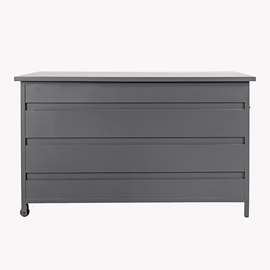 Hoiukast on valmistatud alumiiniumist, mis annab sellele selge ja kaasaegse joonega väljanägemise. Hall toon on neutraalne ning sobib hästi nii tumeda kui ka heledama välis- ja terrassimööbli kõrvale. Metallpind loob korrastatud mulje ja aitab, et kast mõjuks väliruumis diskreetselt, ilma liigselt esile tõusmata.