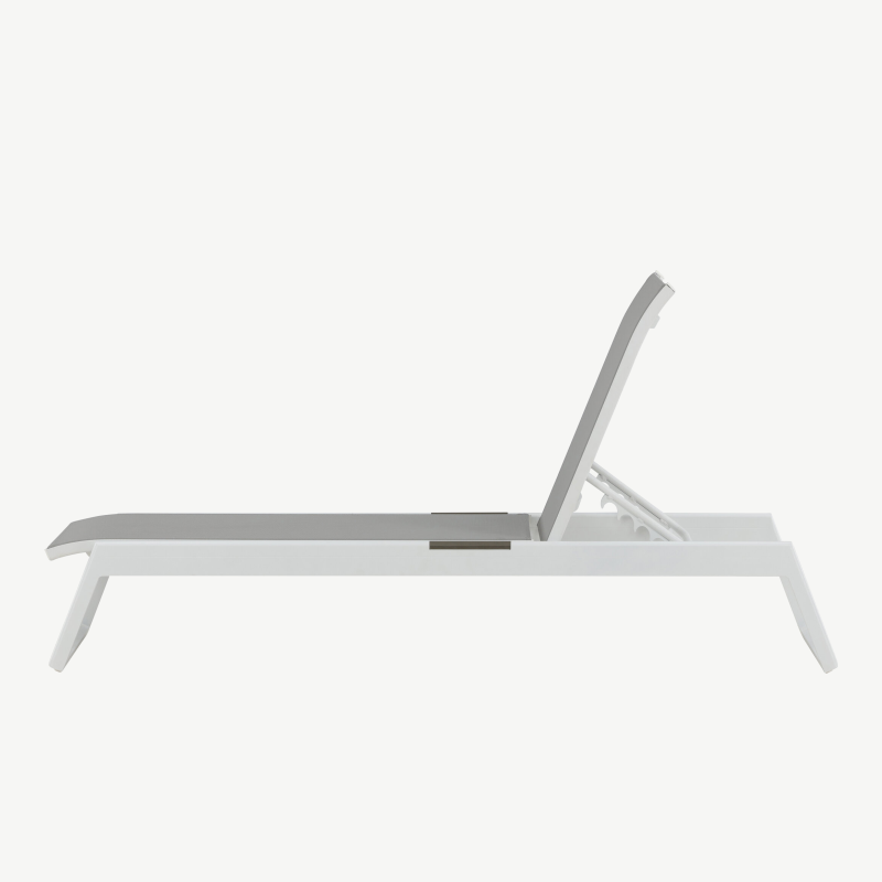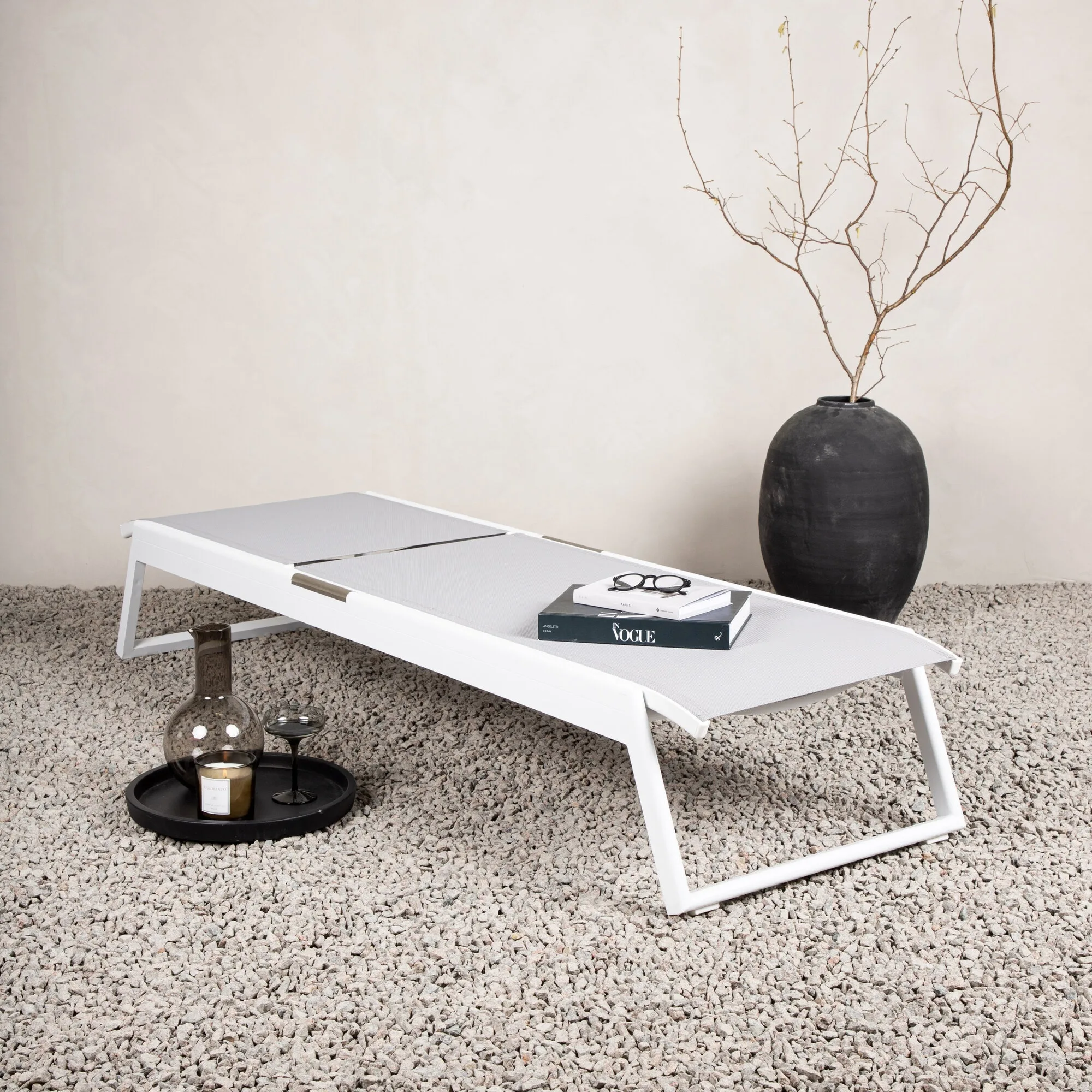 See stiilne lamamistool on valmistatud valgeks lakitud alumiiniumist, mis on kerge, kuid samas tugev ja ilmastikukindel. Istumisosa on kaetud hallist tekstileenist, mis on vastupidav sünteetiline kangas. Tekstileen on PVC-kattega polüester, mis talub nii niiskust kui ka UV-kiirgust, säilitades oma värvi ja kuju ka pikaajalisel kasutamisel.