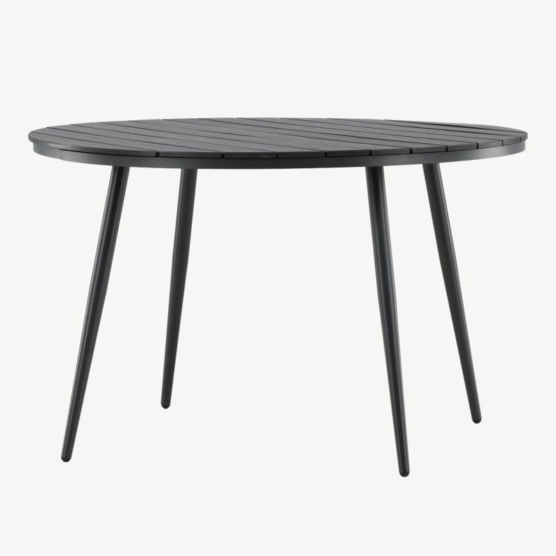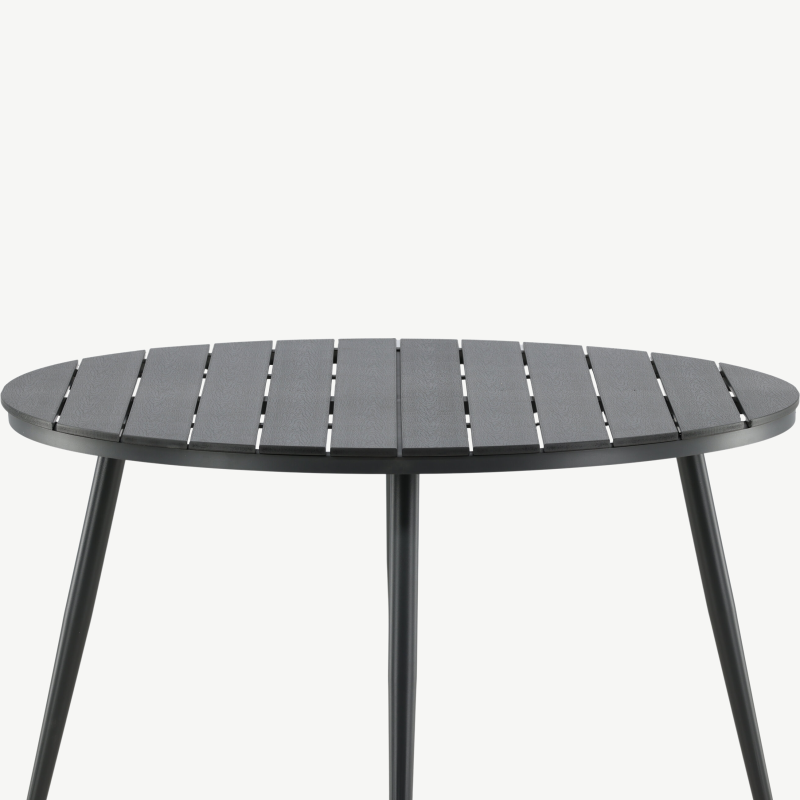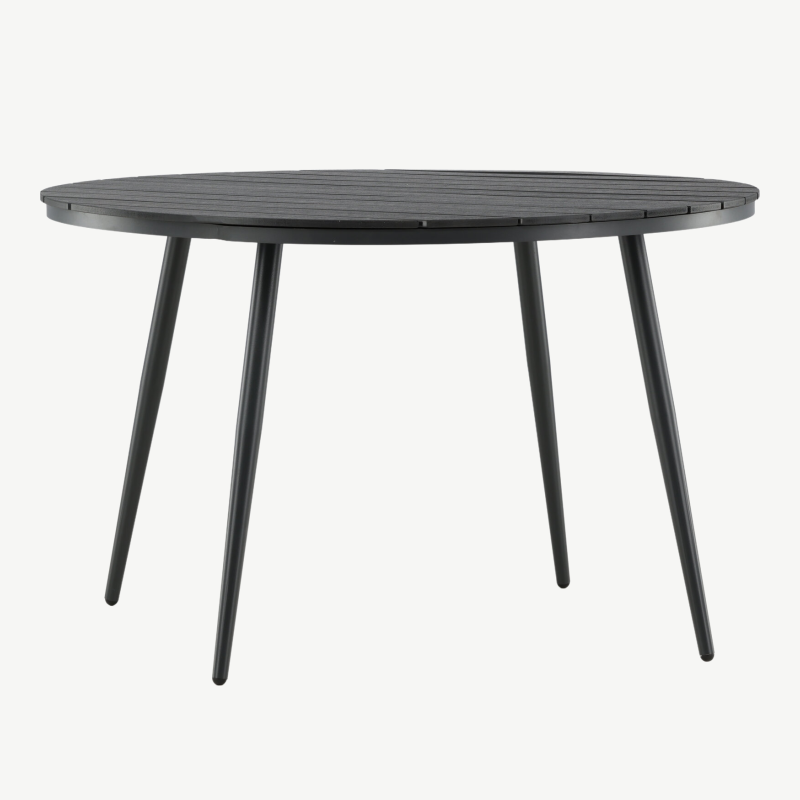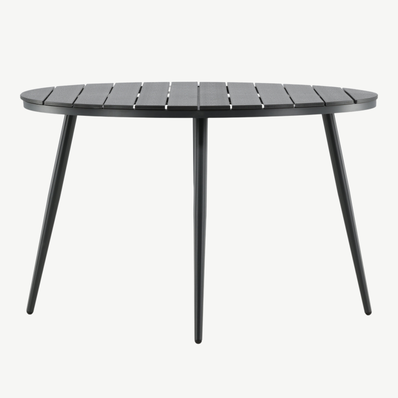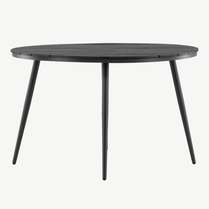 Laua must lauaplaat on valmistatud Puitplastkomposiidist, mis meenutab välimuselt naturaalse puidu ilu, kuid on palju vastupidavam ja ilmastikukindlam. See materjal ei vaja erilist hooldust ning talub nii niiskust kui ka hallitust, mistõttu sobib suurepäraselt välistingimustesse. Laua aluskonstruktsioon on valmistatud tugevast mustast alumiiniumist, mis tagab stabiilsuse ja pikaealisuse ka karmimates ilmastikutingimustes.