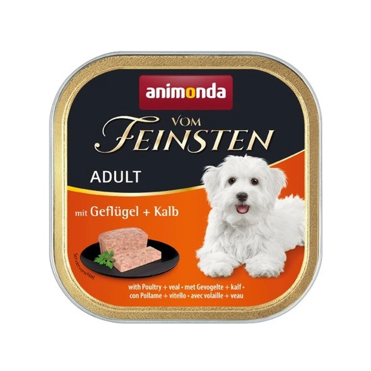 Animonda Vom Feinsten Adult gluteenivaba märgtoit koertele sisaldab linnuliha ja vasikaliha ning sobib täiskasvanud koertele igas suuruses, tagades tasakaalustatud toitumise.