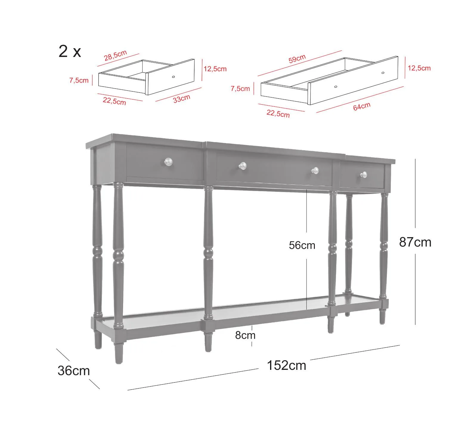 Täiendavad detailid: Keskmine sahtel – 64 x 22,5 x 12,5 cm; külgsahtel – 33 x 22,5 x 12,5 cm; jalgade kõrgus – 8 cm