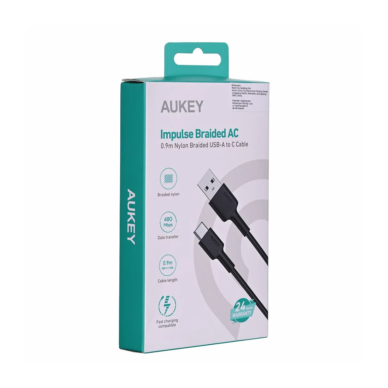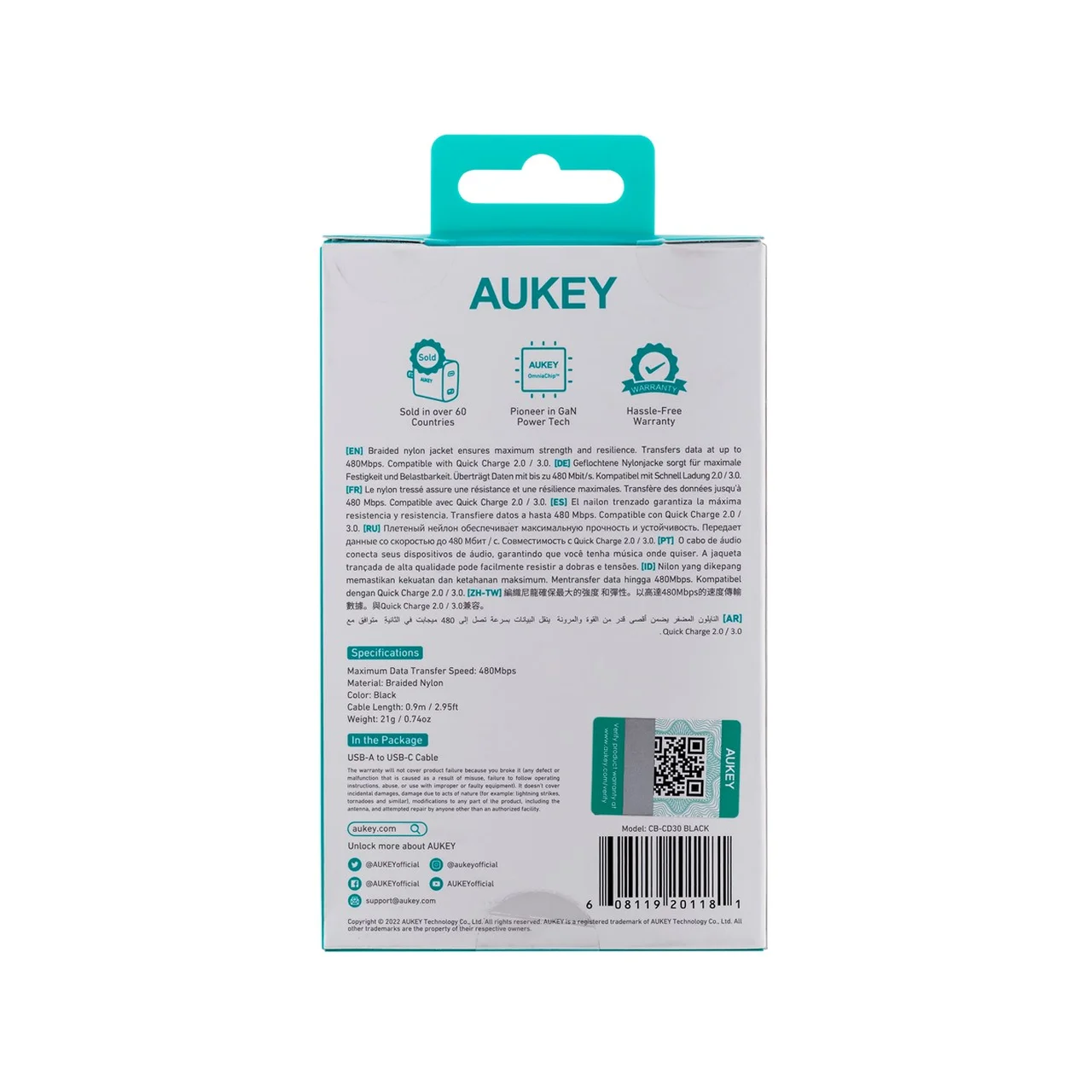 AUKEY CB-CD30 on 0,9 meetri pikkune must nailonpunutisest USB-A–USB-C kaabel, mis toetab kiirlaadimist ja võimaldab kiiret andmeedastust kuni 480 Mbit/s.