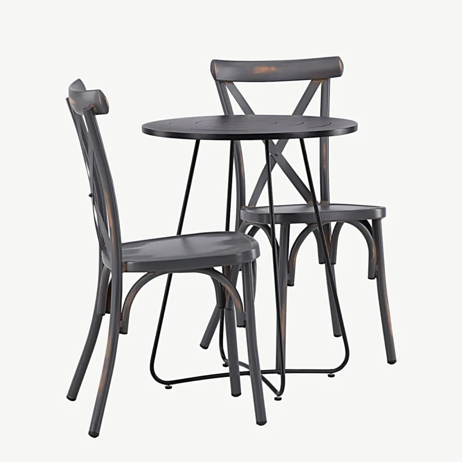 - Kaasaegne värvilahendus – must ümmargune laud ja tumehallid toolid moodustavad stiilipuhta ansambli, mis sobib nii linnakorterisse kui avarasse aianurka.