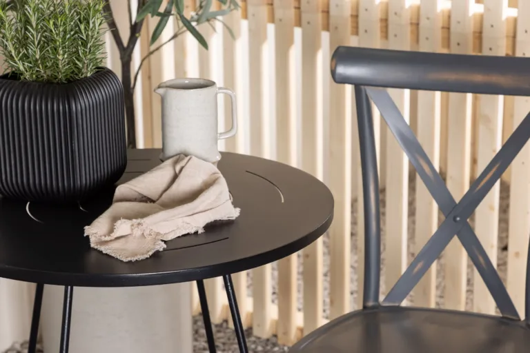 - Tugev terasest laud – mustast terasest ümara plaadiga laud (⌀60 cm) on stabiilne ja vastupidav ning selle minimalistlik joon sobitub igasse välisruumi.