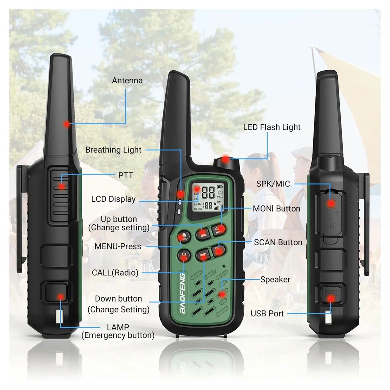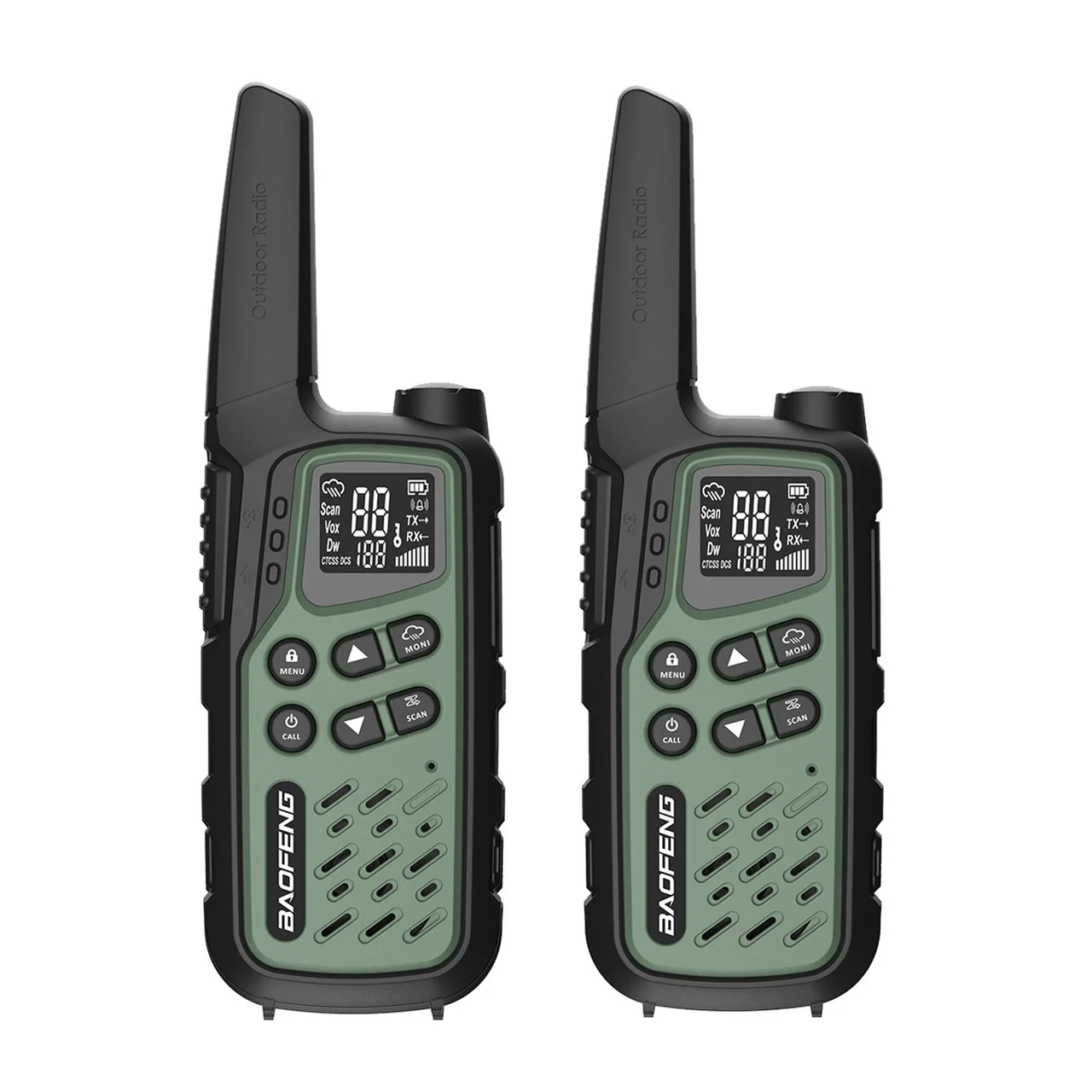 Kompaktne ja vastupidav Baofeng BF-T25E roheline laste walkie-talkie pakub kuni 10 km suhtlusulatust, 16 kanalit ja mugavat Li-Ion akutoidet igapäeva- või välitegevusteks.