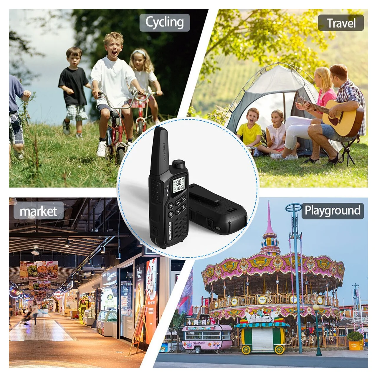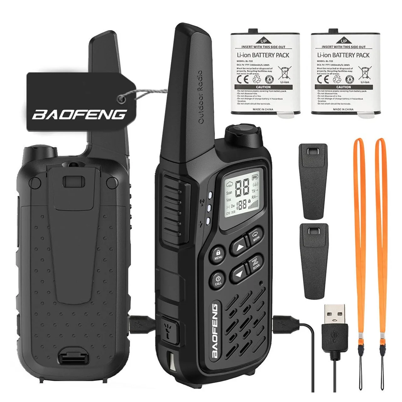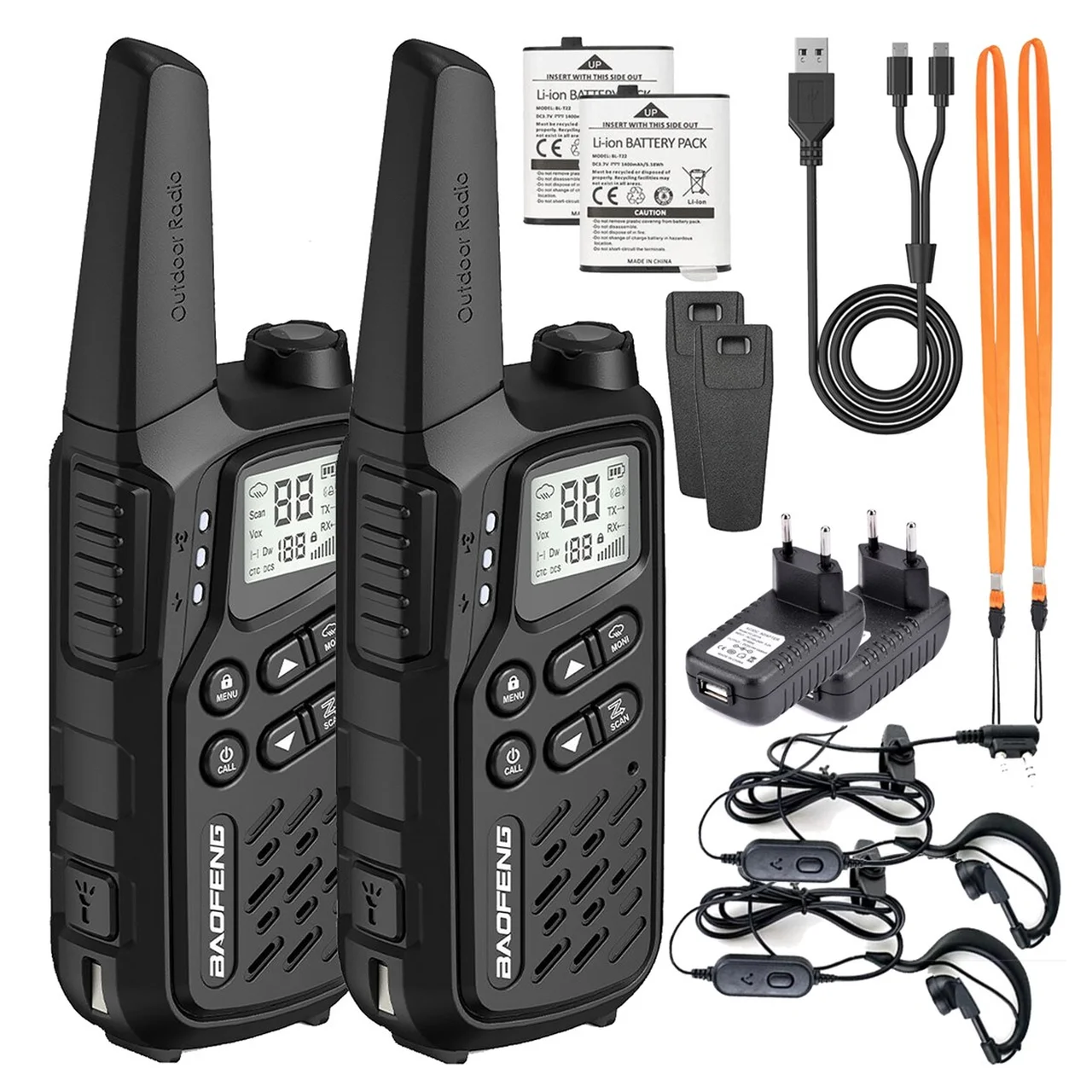 • Komplekti sisu: 2x raadiosaatja, 2x liitiumioonaku, 2x PTT-1 peakomplekti, 1x EU toiteadapter (230V/USB), 1x USB-laadimiskaabel, 2x randmepael, vööklambrid