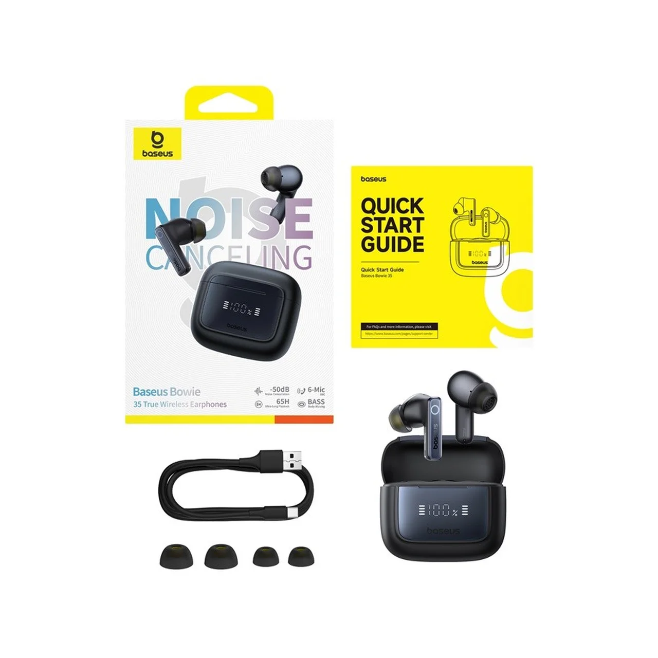 Kui otsid usaldusväärseid musti TWS mürasummutusega kõrvaklappe, mis tagavad pika aku kestvuse, mugava kandmise ja selge heli nii muusika kui ka kõnede jaoks, siis Baseus Bowie 35 pakub suurepärast hinna ja kvaliteedi suhet. Komplektis on kõik vajalik – laadimiskarp, erineva suurusega kõrvaotsikud ja USB Type-C kaabel. Toode sobib nii igapäevaseks kasutuseks kui ka reisimiseks.