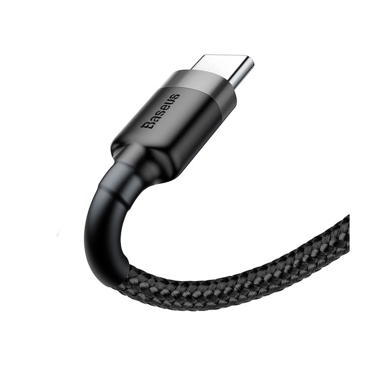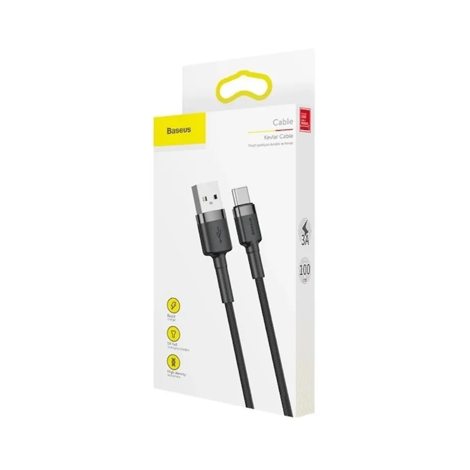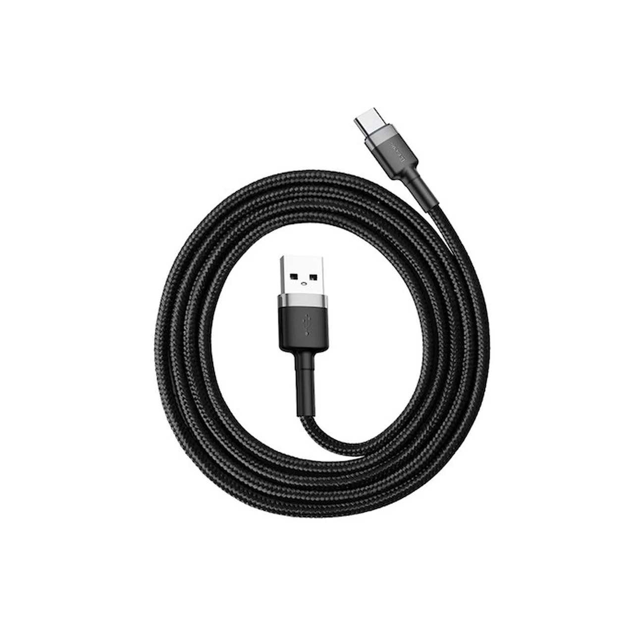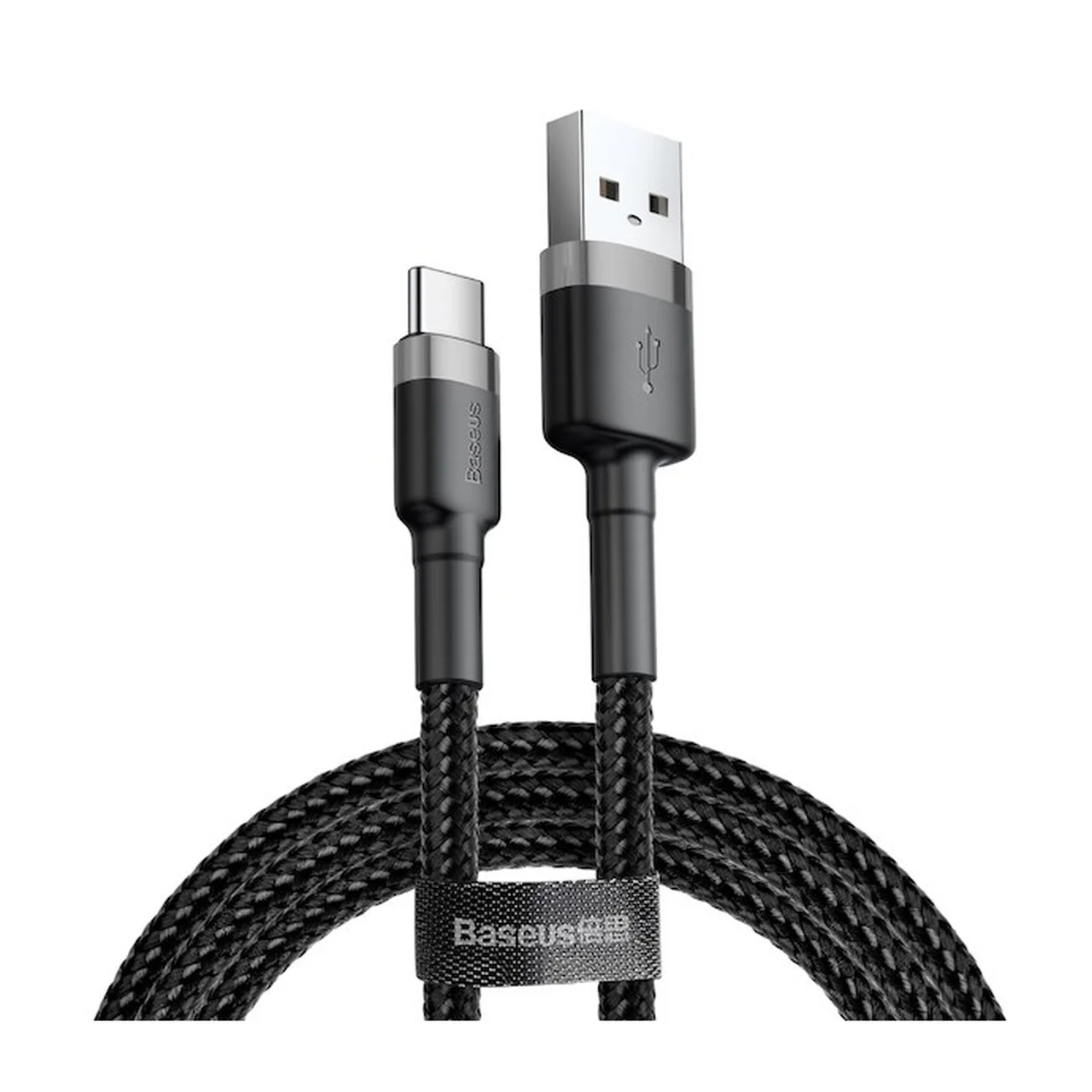 1-meetrine Baseus USB-A–USB-C kaabel musta punutud kattega, toetab kuni 3A kiiret laadimist ja on vastupidav igapäevaseks kasutamiseks.