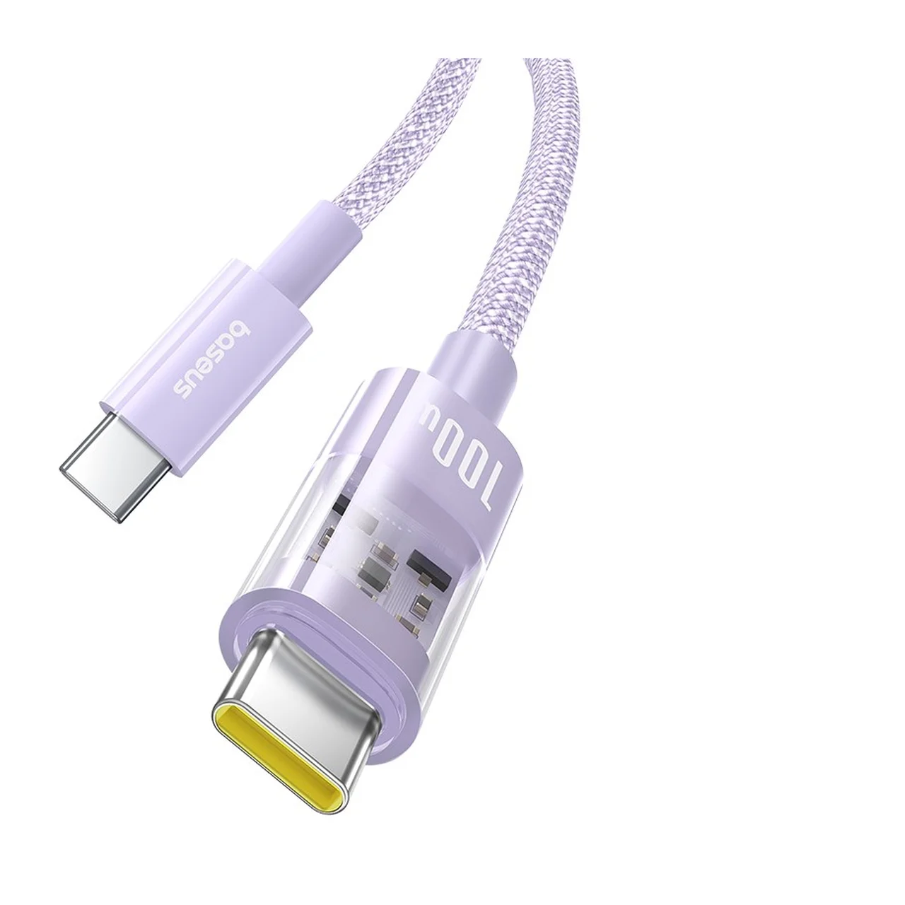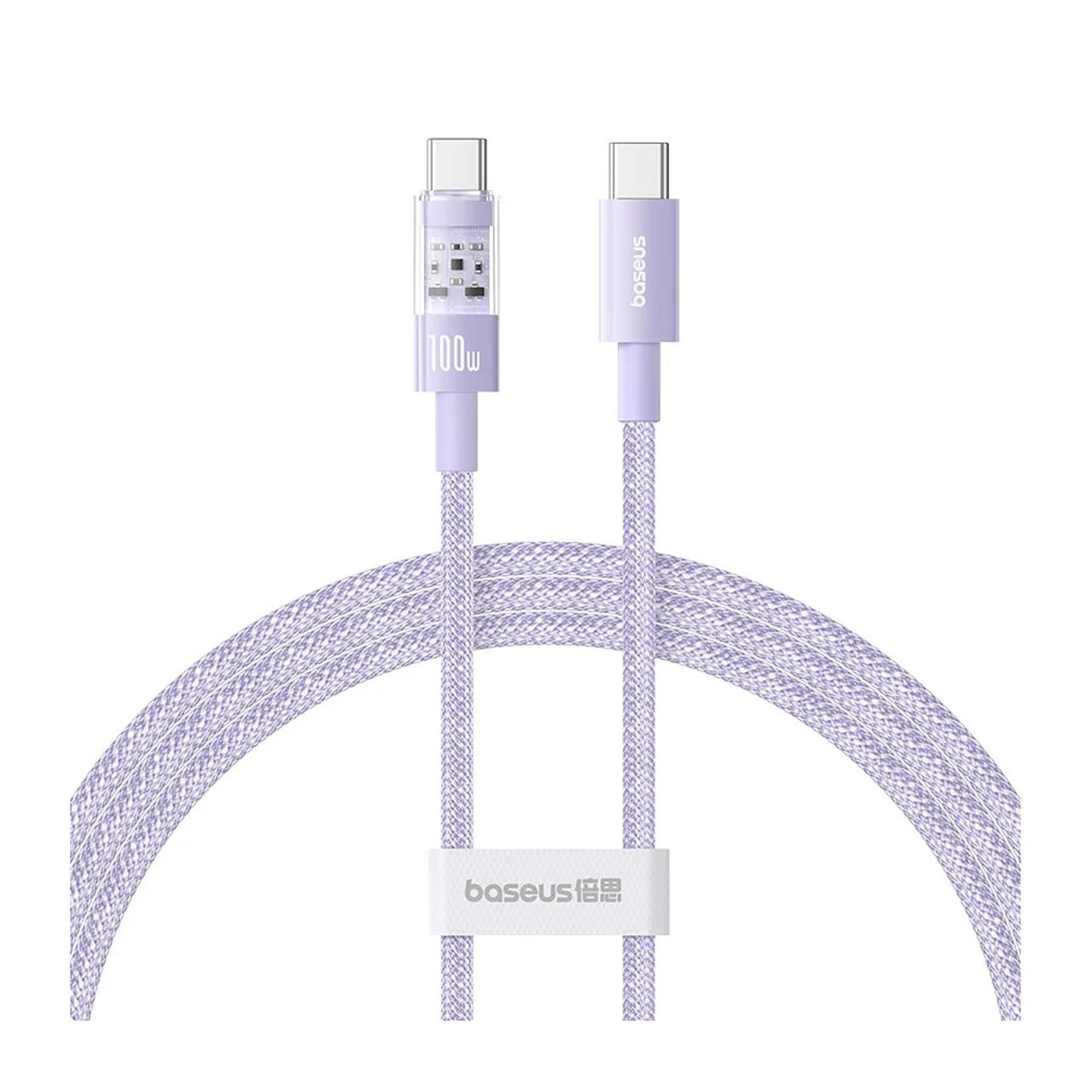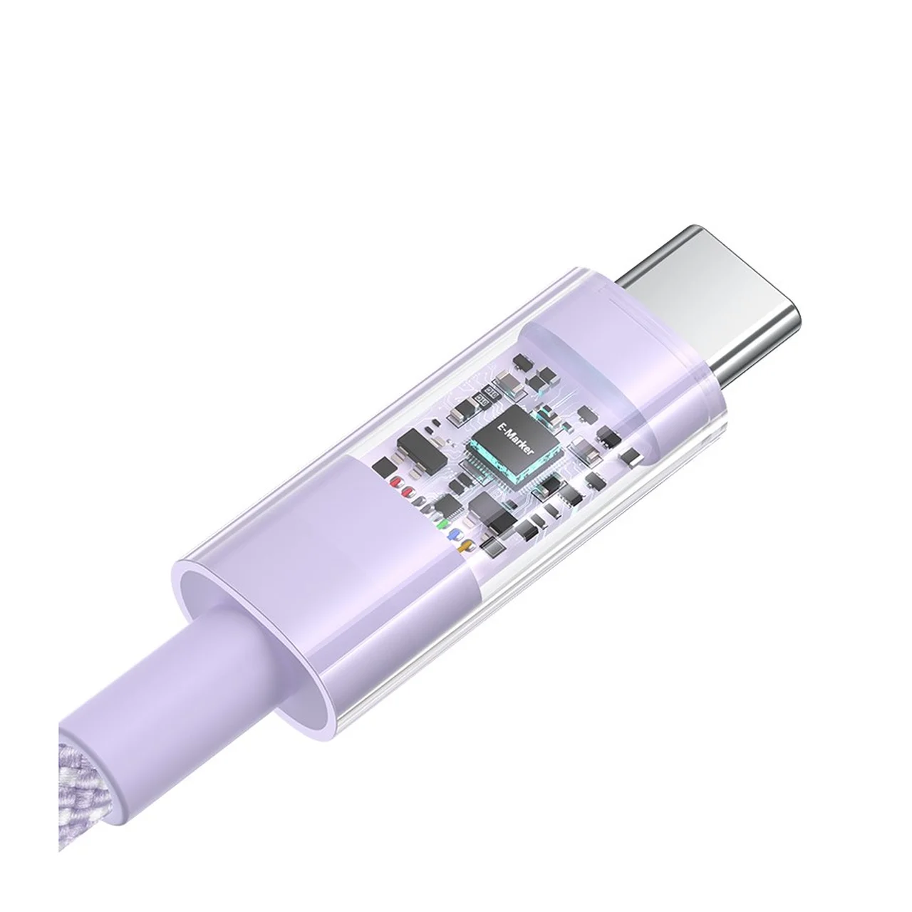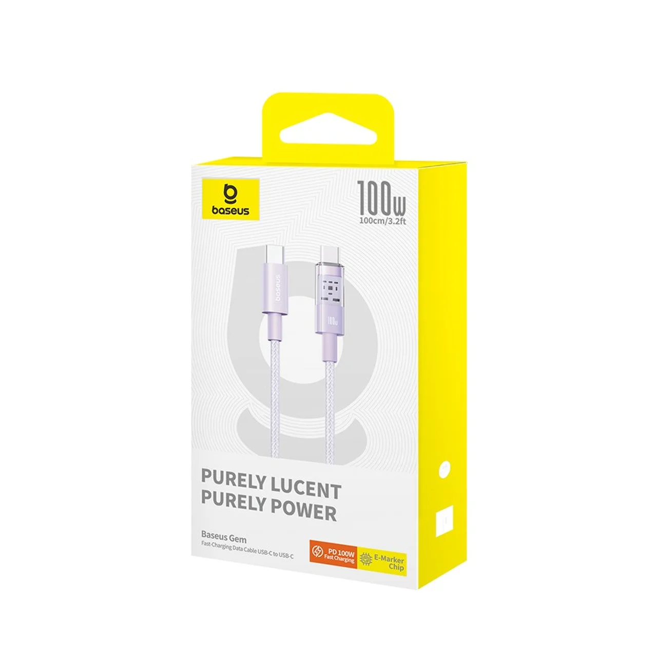 Baseus Gem 1 m USB-C to USB-C kiirlaadimiskaabel võimaldab kuni 100 W laadimisvõimsust ning on vastupidava, lillat värvi nailonkattega.