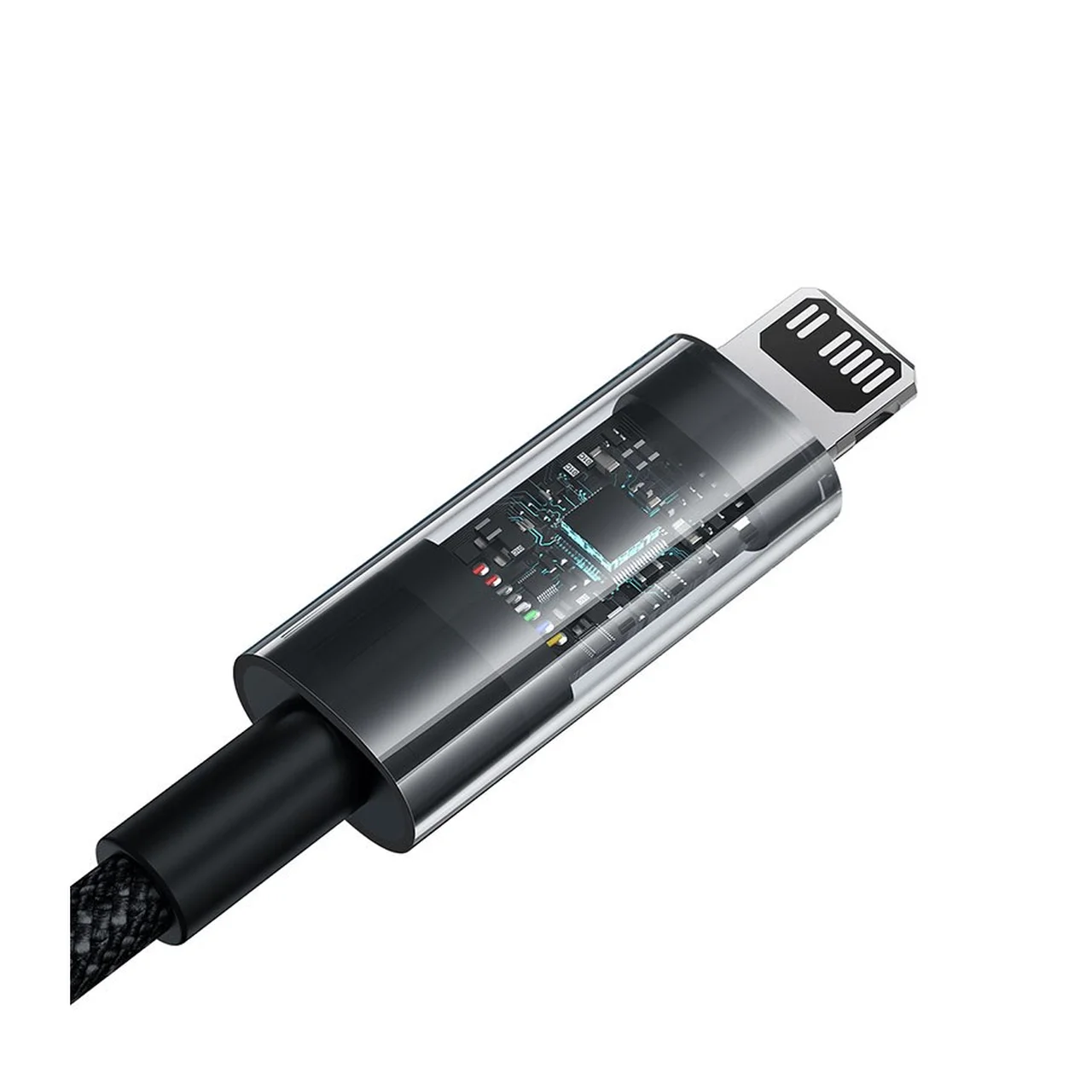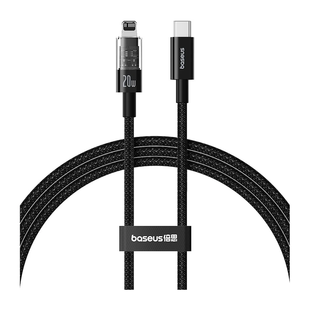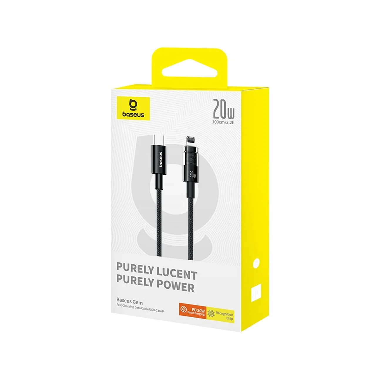 Baseus Gem 1 m must nailonist USB-C – Lightning kaabel toetab kuni 20 W kiirlaadimist ja sobib Apple’i seadmete usaldusväärseks laadimiseks.
