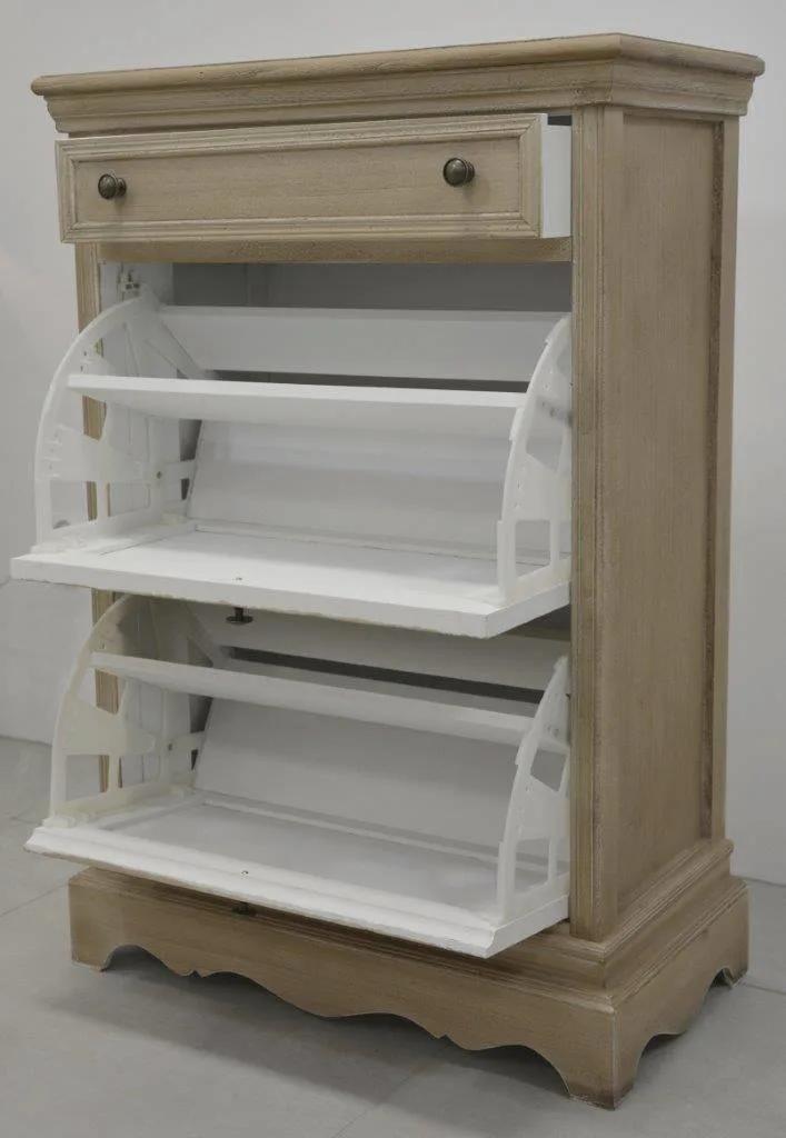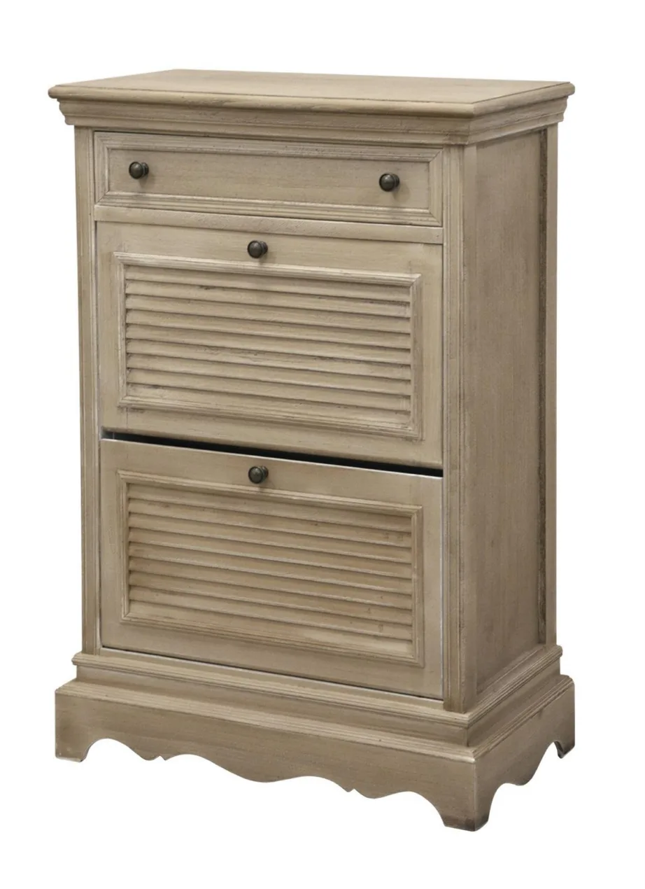 Livorno LIV070 jalanõudekapp esikusse. See stiilne, käsitsi värvitud jalanõudekapp ühendab provansaalse ja boho stiili, pakkudes elegantset lahendust teie esikusse. Dekoratiivsed messingivärvi metallist käepidemed, sahtlite esipaneelidel olevad dekoratiivsed luugid ning keeratud jalad lisavad sellele kapile unikaalset iseloomu. Kapi korpus, pealisplaat ja soklid on töödeldud mitteühtlase beeži tooniga, millele lisab iseloomu valge kulutus.