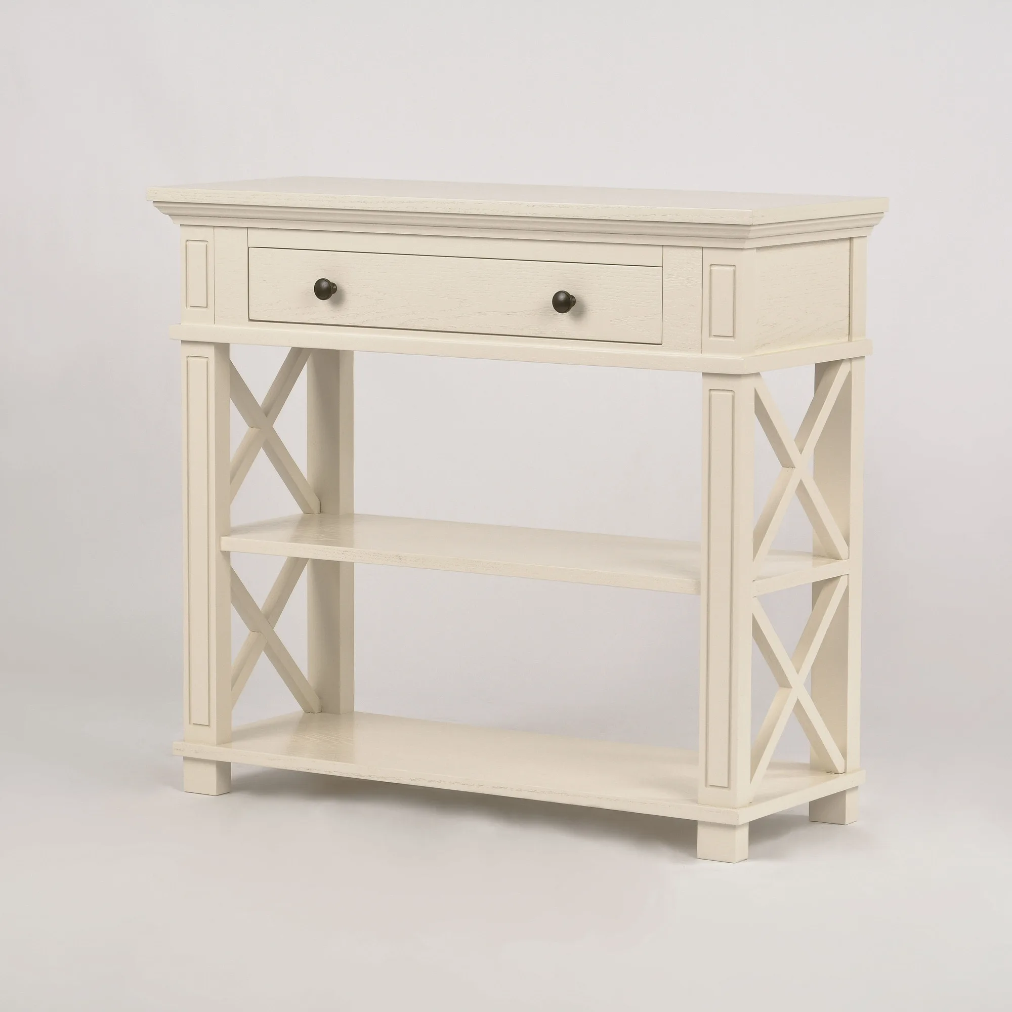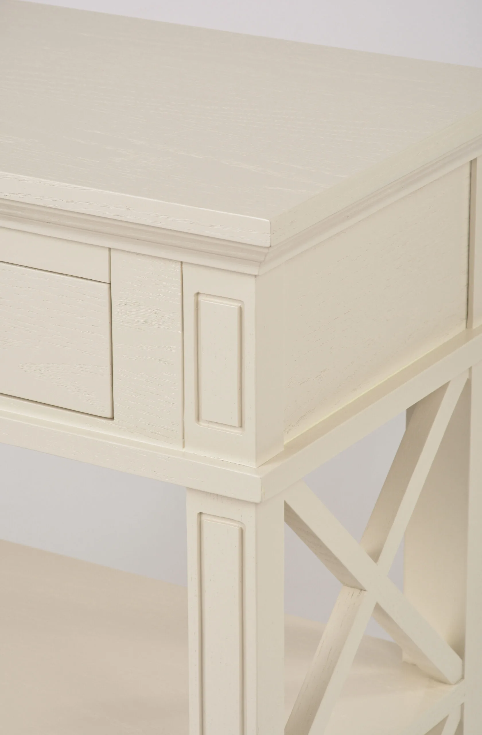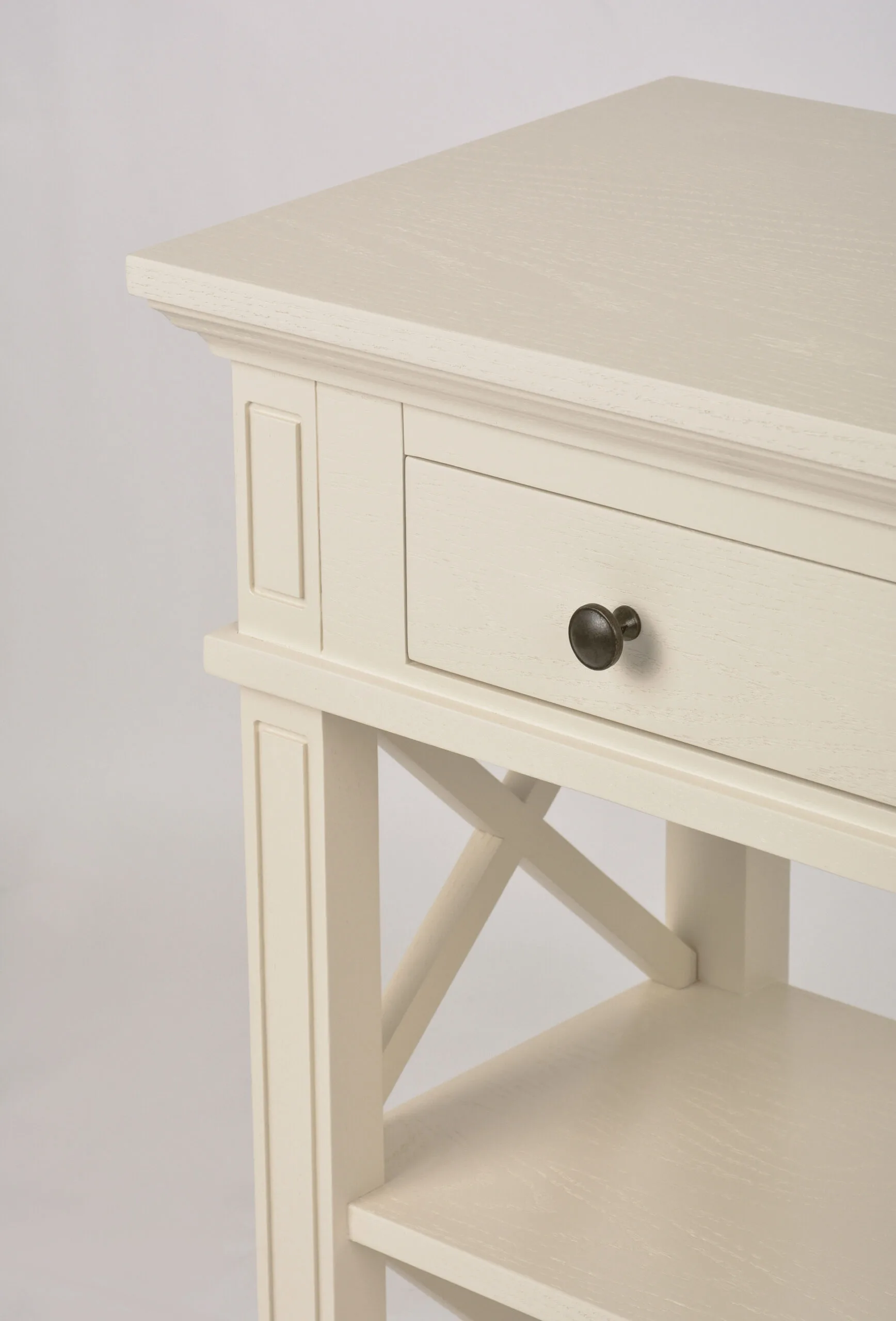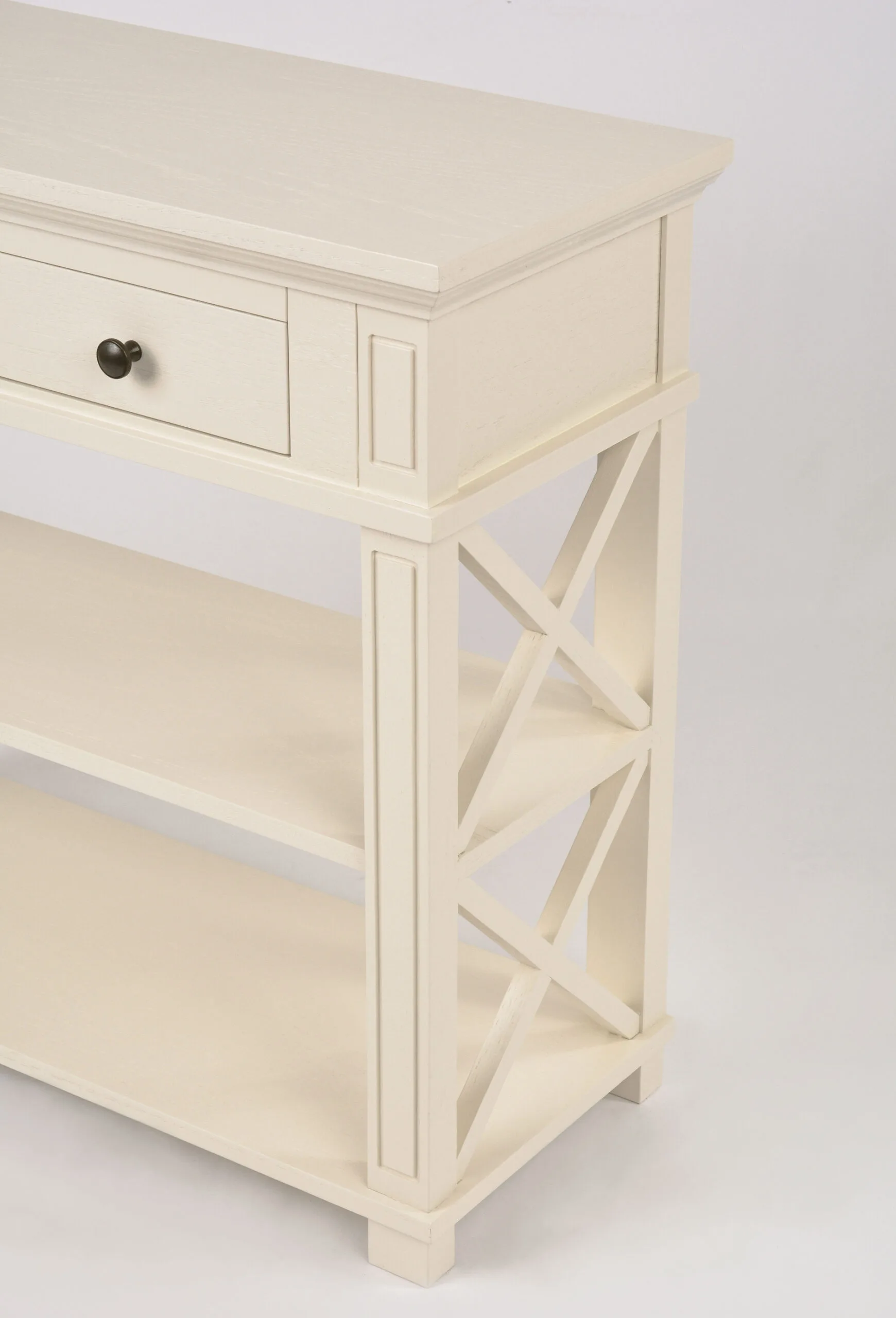 Hamilton HT028 konsoollaud esikusse. See elegantne konsoollaud Zona-Light kollektsioonist toob teie esikusse Hamptoni stiili võlu. Kreemjas tammepuidust valmistatud laual on avatud X-kujulised küljed, millel on freesitud jalad ja servad, ning harjatud pind kulumisjälgedega, mis annavad sellele ainulaadse iseloomu.