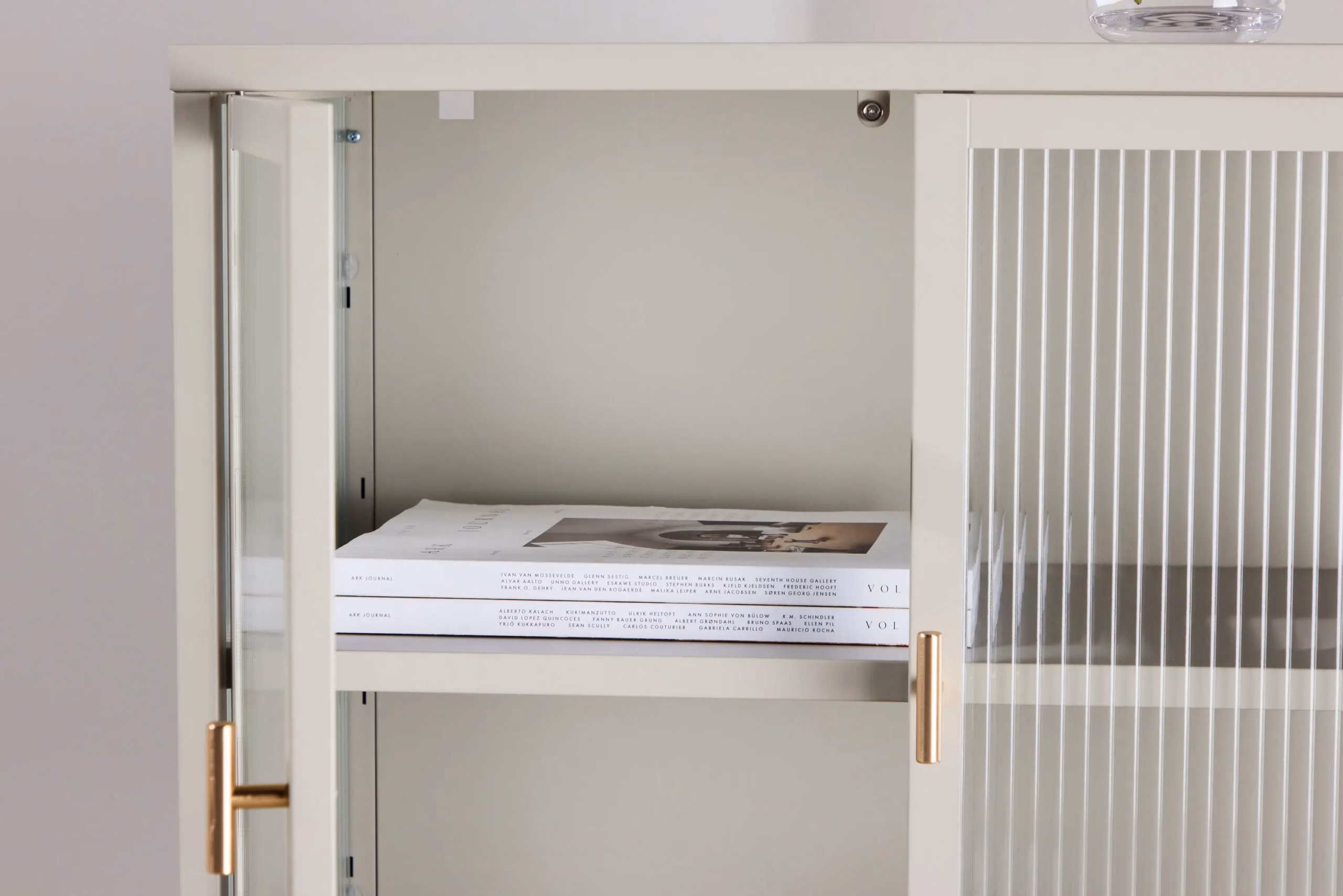 • Kaks klaasust vertikaalse mustriga – klaas annab hea nähtavuse, kuid kerge tekstuur muudab sisu vähem esiletungivaks, hoides ruumi visuaalselt korras.