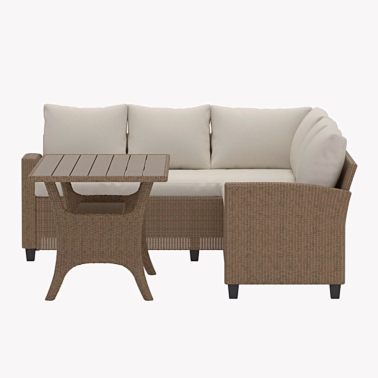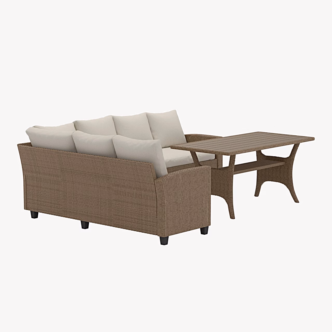 - Vähest hooldust nõudev aiadiivanikomplekt – kunstrotang ja puitplastkomposiit on loodud välistingimustesse, taludes hästi UV-kiirgust, vihma ja tuult, mistõttu saad nautida komplekti ilu ja funktsionaalsust aastaid.