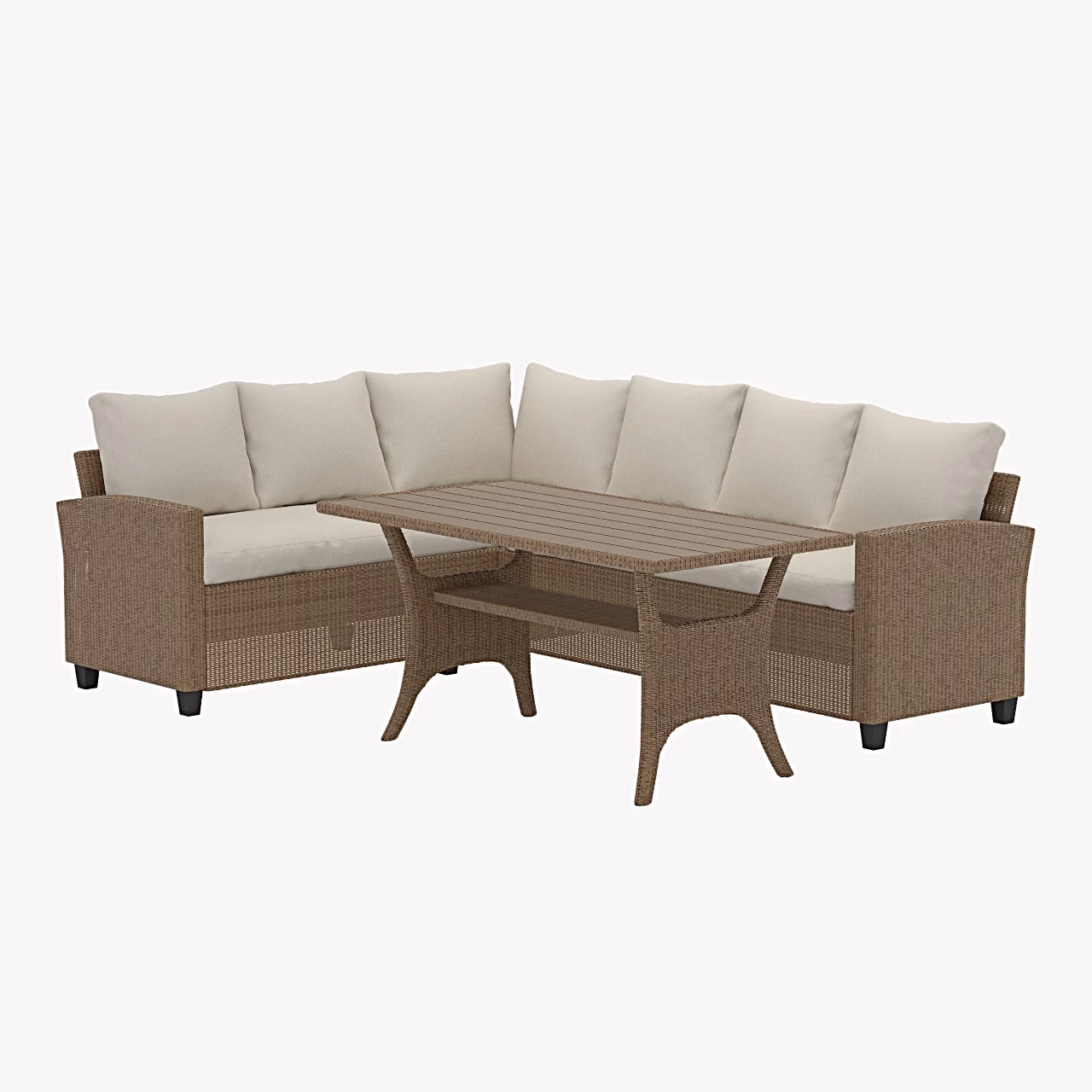 Venture Home Brentwood beež aiadiivanikomplekt on loodud selleks, et muuta Sinu aed, rõdu või terrass hubaseks istumispaigaks perele ja sõpradele. Avar nurgadiivan mõõtudega umbes 180 x 240 cm pakub rohkelt istekohti, pehmed heledad polüesterpadjad loovad kutsuva tunde ning toetavad mugavalt ka pikemal istumisel. Kaunilt punutud kunstrotangist (wicker) viimistlus ja neutraalne beež värv sulanduvad loomulikult nii põhjamaise puitarhitektuuri kui ka modernse kivifassaadiga. Komplekti kuuluv ristkülikukujuline laud on piisavalt suur, et katta nii õhtusöök kui ka hommikukohv, ning sobib suurepäraselt nii igapäevaseks kasutuseks kui ka pikkadeks suveõhtuteks.