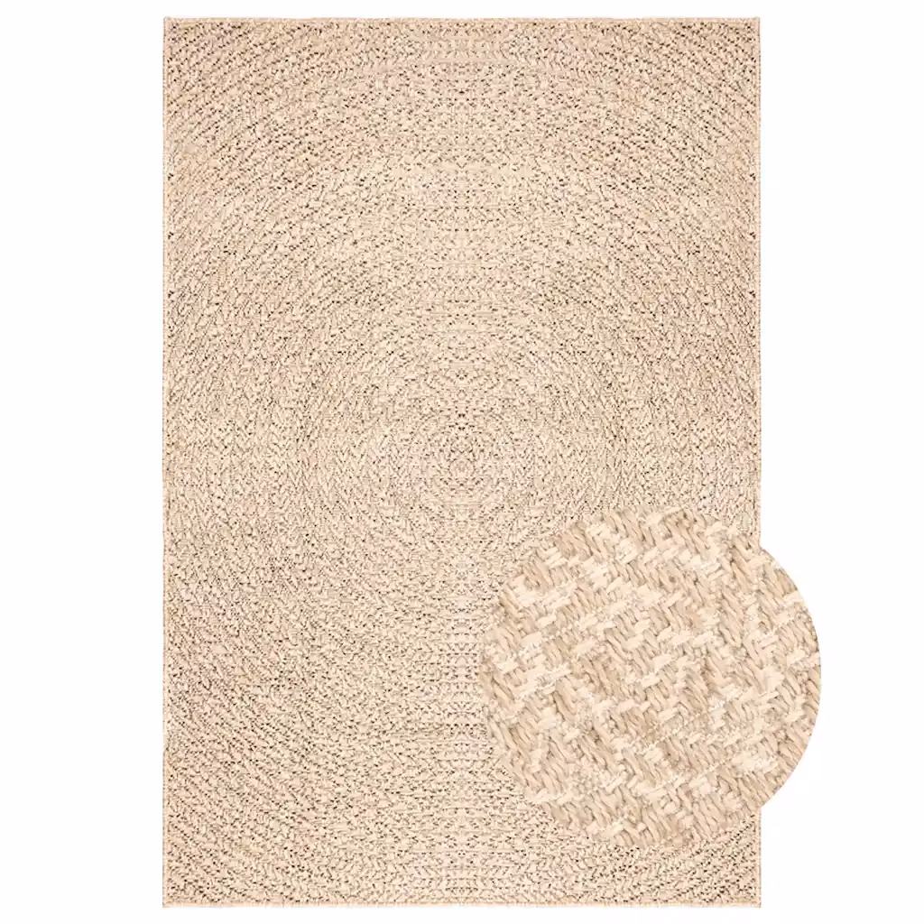 Beež sise- ja õuevaip ZIZUR loob hubase meeleolu nii toas kui terrassil, rõdul või aias. 100% polüpropüleenist valmistatud džuudi välimusega pind annab interjöörile loodusliku ilme, kuid on samas vastupidav ja lihtsasti hooldatav. Suur 240 x 340 cm mõõt katab mugavalt suurema istumis- või puhkeala.